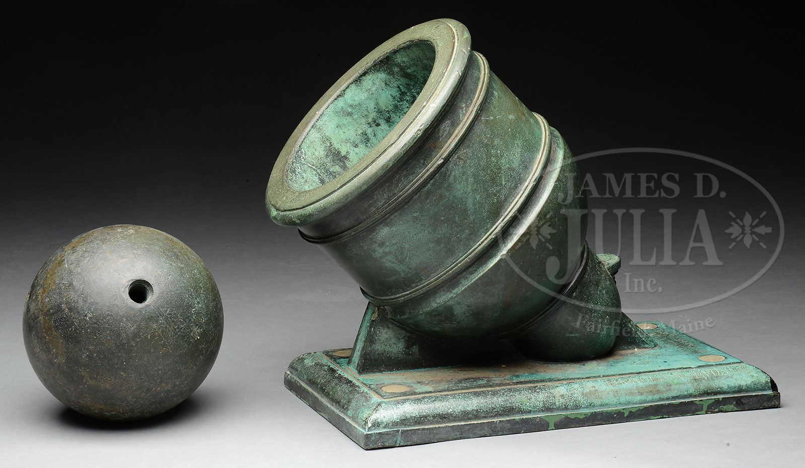 RARE 1826 DATED SPANISH BRONZE 7-1/2″ EPROUVETTE MORTAR WITH ORIGINAL 7-1/2” COPPER SHOT.SN 7663. This beautiful bronze mortar has emerald green patina and fine markings as can be seen in photos. Monogram of King Ferdinand VII is engraved over vent and cannon’s name “OEBOAS” in a banner of unknown translation. Baseplate is engraved around border “No. 7663”, “SEVILLA IDE DICIEMBRE DE 1826” manufactured at Seville, December 1, 1826. Base is also marked in Spanish with the origin of the copper and a weight of “190” lbs, “BRONCES NUEVOS DE COBRE DE LIMA”. Eprouvettes historically were used to measure quality of gun powder by shooting a projectile and measuring the distance fired as the Eprouvette has a fixed angle and the projectile is of an exact weight. In this case the projectile has a cavity that would be closed by a threaded fuse-like cap that could be filled with cast lead. Genuine Eprouvettes are quite rare and this may be the only example ever offered with its orig bronze globe projectile with a matching engraved arrow to align positioning to arrow on top of cannon. This cannon is thought to have been a souvenir taken home as a trophy from the Spanish-American War, as there is an almost identical pair photographed as captured weapons in Manila in 1898 in a book by Karl Irving Faust on p.105 (published 1899) Campaigning in the Philippines. PROVENANCE: Estate near Louisville, KY. Joe Ley Antiques, Louisville, KY. Springfield Arsenal, LLC Artillery Collection. CONDITION: Overall very good to fine. Markings are all discernible. Four 1” holes in baseplate are filled where originally they would have had bolts attaching them to large heavy wooden plank. Baseplate or “sole” of mortar measures 17” X 9-1/2” and is 1-1/2” thick. Height overall is about 16” and bore is 7-1/2” and projectile measures to a very close tolerance with only a few hundredths of an inch to spare. Patina on mortar and ball are mostly a mottled emerald green. Projectile “globe” is missing its threaded plug but engraved 5” feathered arrow (matching arrow on muzzle face) is quite discernible as can be seen in photos. 4-54135 (8,000-12,000) – Lot 2095 Click here to view provenance