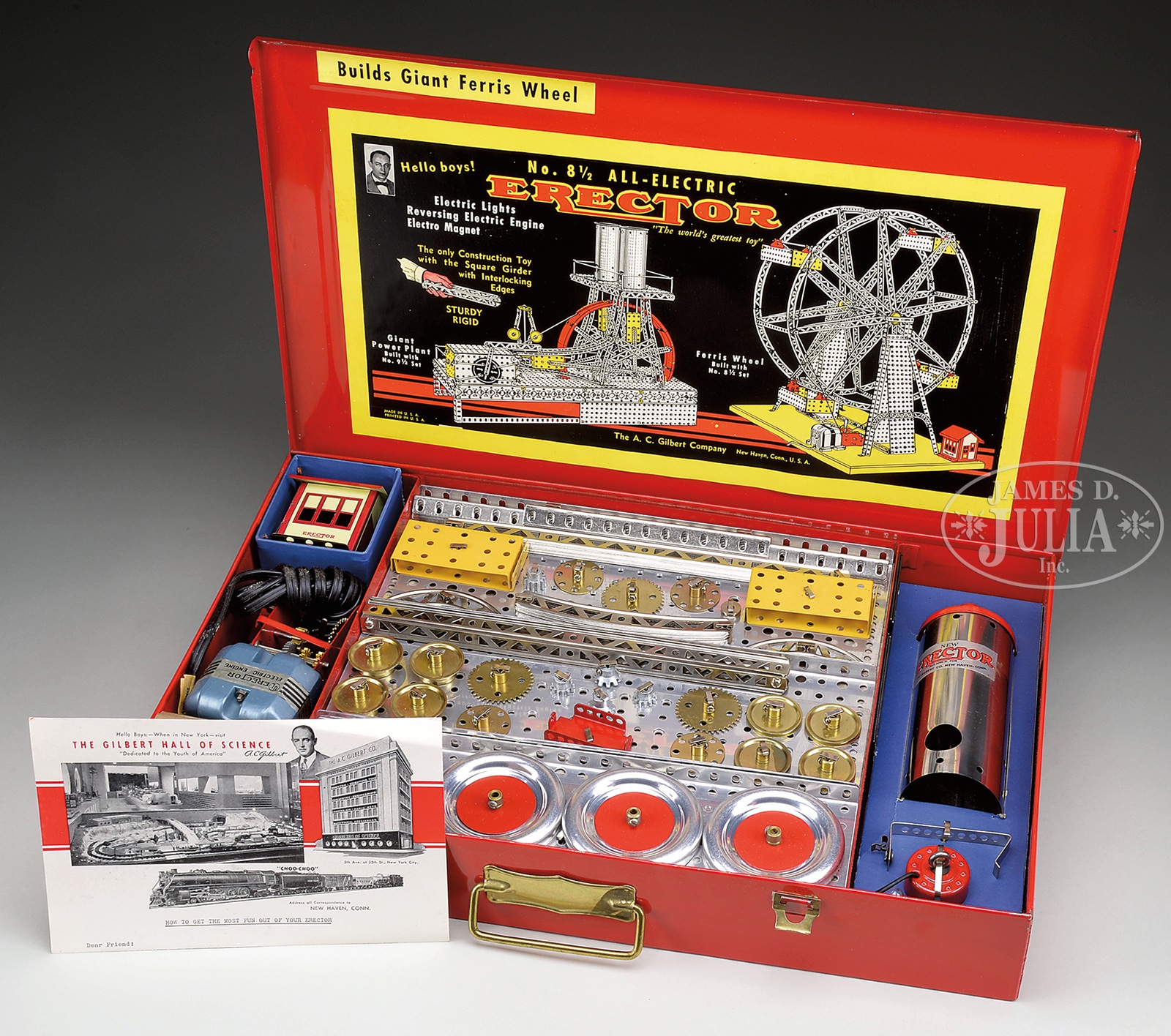 GIANT NO. 8-1/2 ERECTOR SET IN OB.A.C. Gilbert Co., New Haven, CT. An amazingly complete post-war electric Erector set with all contents still attached in original high gloss red metal box. This set builds the large ferris wheel and other advanced construction toys. Electric motor still has coiled cord and set retains original packing insert & instructions. SIZE: Box is 12″ x 20″. CONDITION: Excellent to near mint. Toy set retains 100% interior and exterior labels-appears unused. 49026-2 (600-900) – Lot 2096 Auction: Advertising, Toy & Doll - Spring 2015 Please Note: All prices include the hammer price plus the buyer’s premium, which is paid by the buyer as part of the purchase price. The prices noted here after the auction are considered unofficial and do not become official until after the 46th day. |