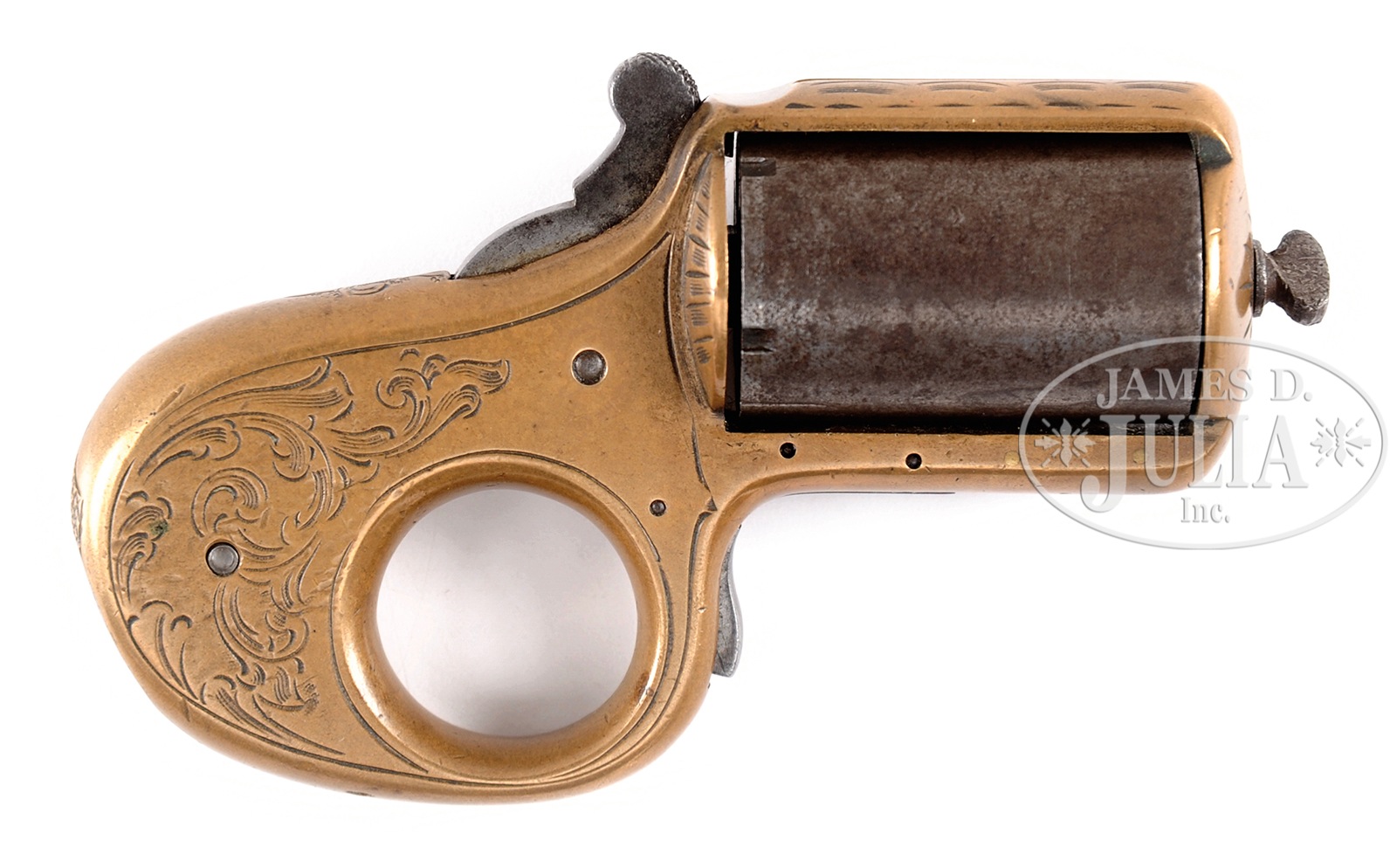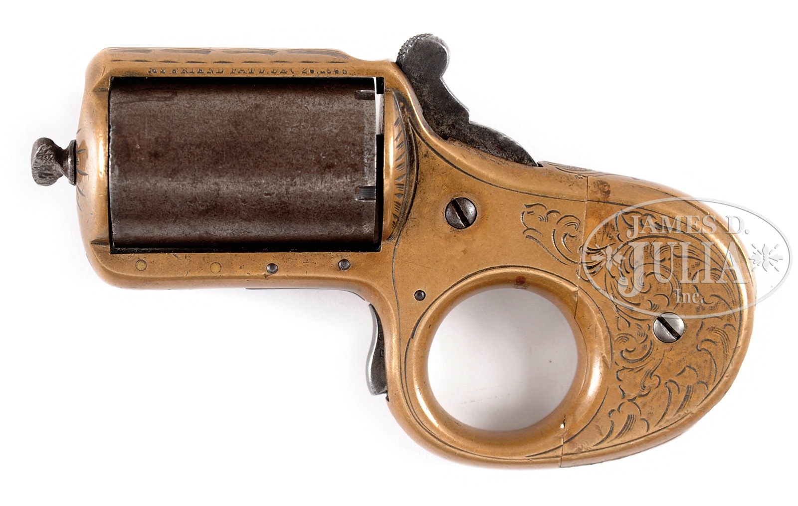 VERY GOOD 32 CALIBER KNUCKLEDUSTER BY JAMES REID.SN 10078. Cal. 32 RF. Transitional Knuckleduster pattern frame manufactured of brass. Single action with spur trigger and 5-shot cyl. Scroll and vine New York pattern engraving and marked “MY FRIEND” followed by patent dates on the frame above cyl. Late production model manufactured without trigger safety device. Frame manufactured with safety slot but plugged by Reid with a piece of brass as a cost cutting measure. Known as the Transition model. A numbers matching gun with matching numbers found on frame, trigger, cyl and cyl pin. PROVENANCE: The Carmen Gianforte Collection. CONDITION: Good overall, with traces of silver wash in very protected areas. A slight dent in the rear frame from being dropped or possibly striking someone. Cyl has a fracture over one chamber which is of the period. Brass has mellowed with a very pleasant patina overall as the cyl and cyl pin have also acquired a pleasant patina. Chambers and mechanics are fine. 50603-33 TDW (2,000-3,000) – Lot 2097 Click here to view provenance