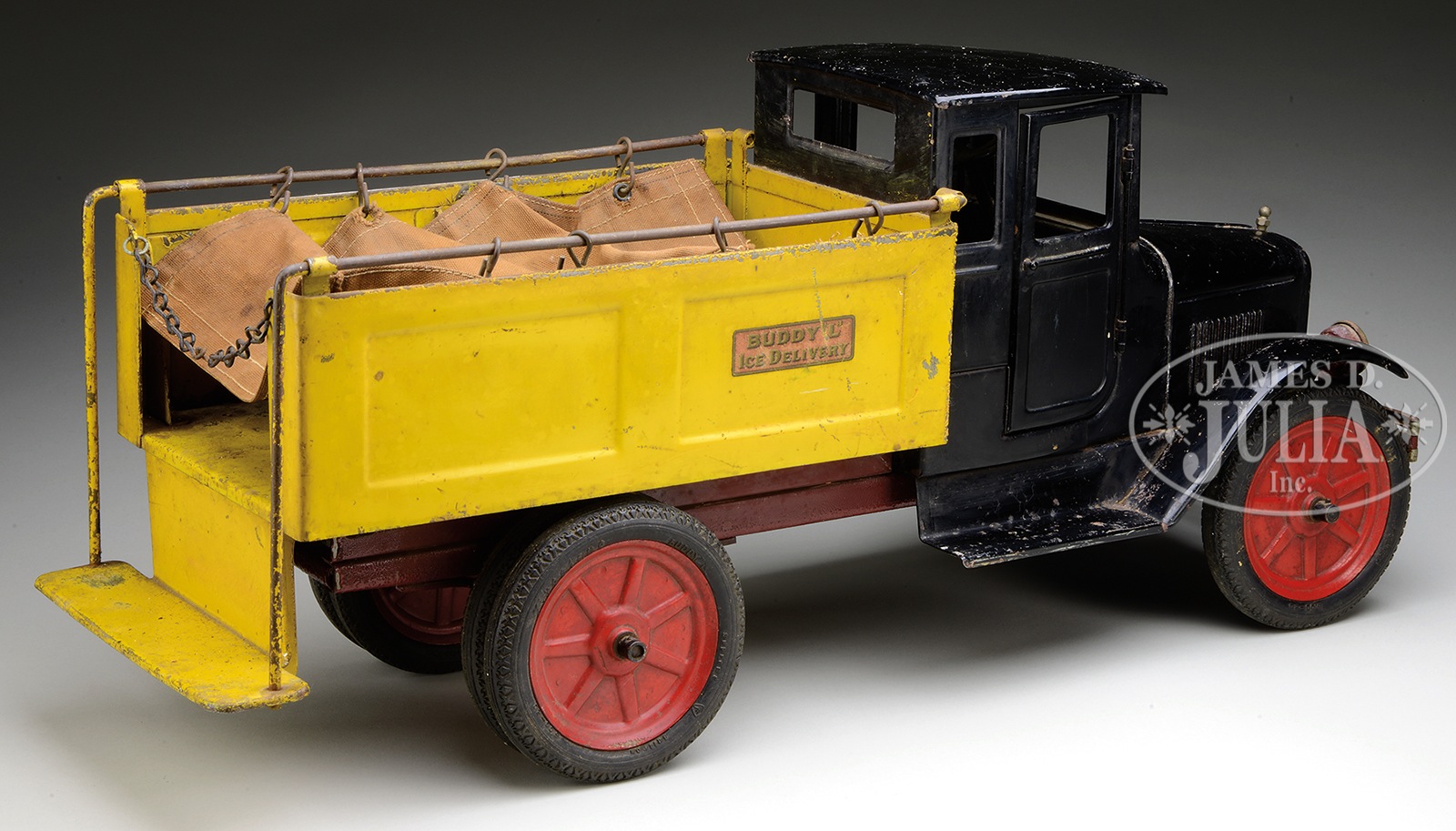 BUDDY L DOORED ICE TRUCK.The best of the best, these elaborate and costly Buddy L trucks from the latter part of the 1930s, this particular vehicle features rubber tires over steel discs, a front bumper with simulated headlights, and a closed cab with opening doors. These particular vehicles with this particular body style are some of the more sought after and desirable in the pressed steel world. Truck still retains its original canvas, which is intact overall, but missing a few grommets. The black ice tongs are present, but the ice has melted with age. Truck overall is in very good condition and would benefit by a light cleaning. The truck bed has the same degree of wear as the rest of the vehicle with no excessive wear/scrapes to the bed. Decals intact on either side as well as in the interior of the cab and on the radiator and front bumper as well. Fresh to the market from a New England collector. SIZE: 26-1/2″ l. CONDITION: Overall good to very good. 30140-3 (2,000-4,000) – Lot 2098 Auction: Advertising, Toy & Doll - Spring 2015 Please Note: All prices include the hammer price plus the buyer’s premium, which is paid by the buyer as part of the purchase price. The prices noted here after the auction are considered unofficial and do not become official until after the 46th day. |