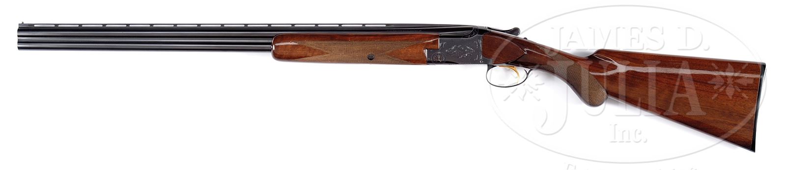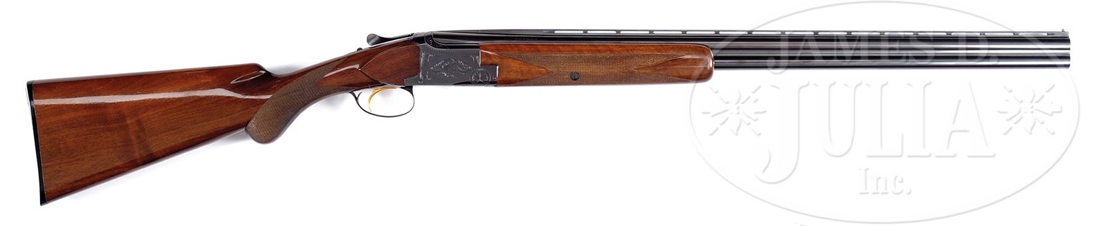 *20 GAUGE BROWNING SUPERPOSED LONG TANG ROUND KNOB GRADE 1 “LIGHTNING”.SN 26852V2. Cal. 20 ga. ca.1962. 3″ Chambers. 26-3/8″ Bbls are marked for IC and mod, and are fitted with narrow, ventilated rib with silver bead. Bbls are marked with Browning St. Louis and Montreal addresses, as well as steel and chamber info on left, and with patent info and “MADE IN BELGIUM” on right. Standard blued superposed action is engraved with typical grade 1 flourishes of scroll, and is fitted with gold-plated sgl selective trigger. Slightly figured American walnut long tang round knob buttstock measures 14″ over Browning composition buttplate. Standard checkering is at grip. Matching forend is of field type. Bore diameter: top -.619, bottom -.619. Bore restrictions: top -.015 (mod), bottom -.008 (IC). Drop at heel: 2-1/4″, drop at comb: 1-1/2″. Weight: 6 lbs 4 oz. LOP: 14″. CONDITION: Excellent, appears near new, with only a hint of sharp edge wear on factory finishes on metal, and with several minor marks in gloss finish of wood. Gold is excellent, with some rubs from trigger plate. Mechanically crisp. 49033-18 MGM254 (2,000-3,000) – Lot 2098