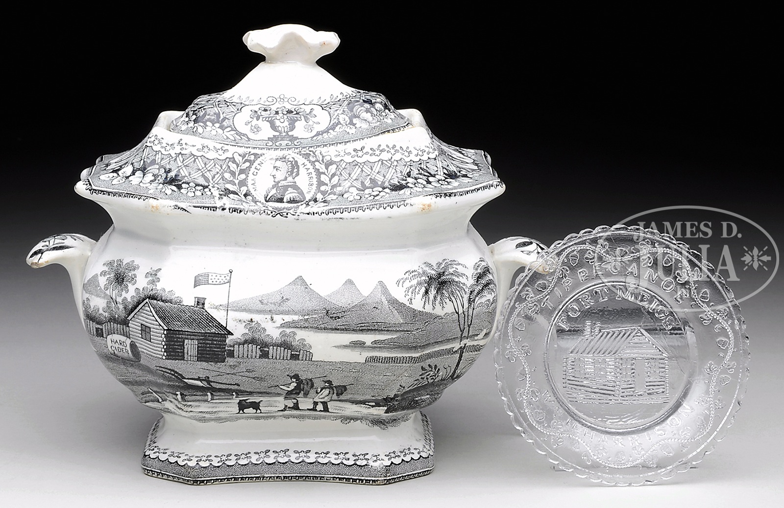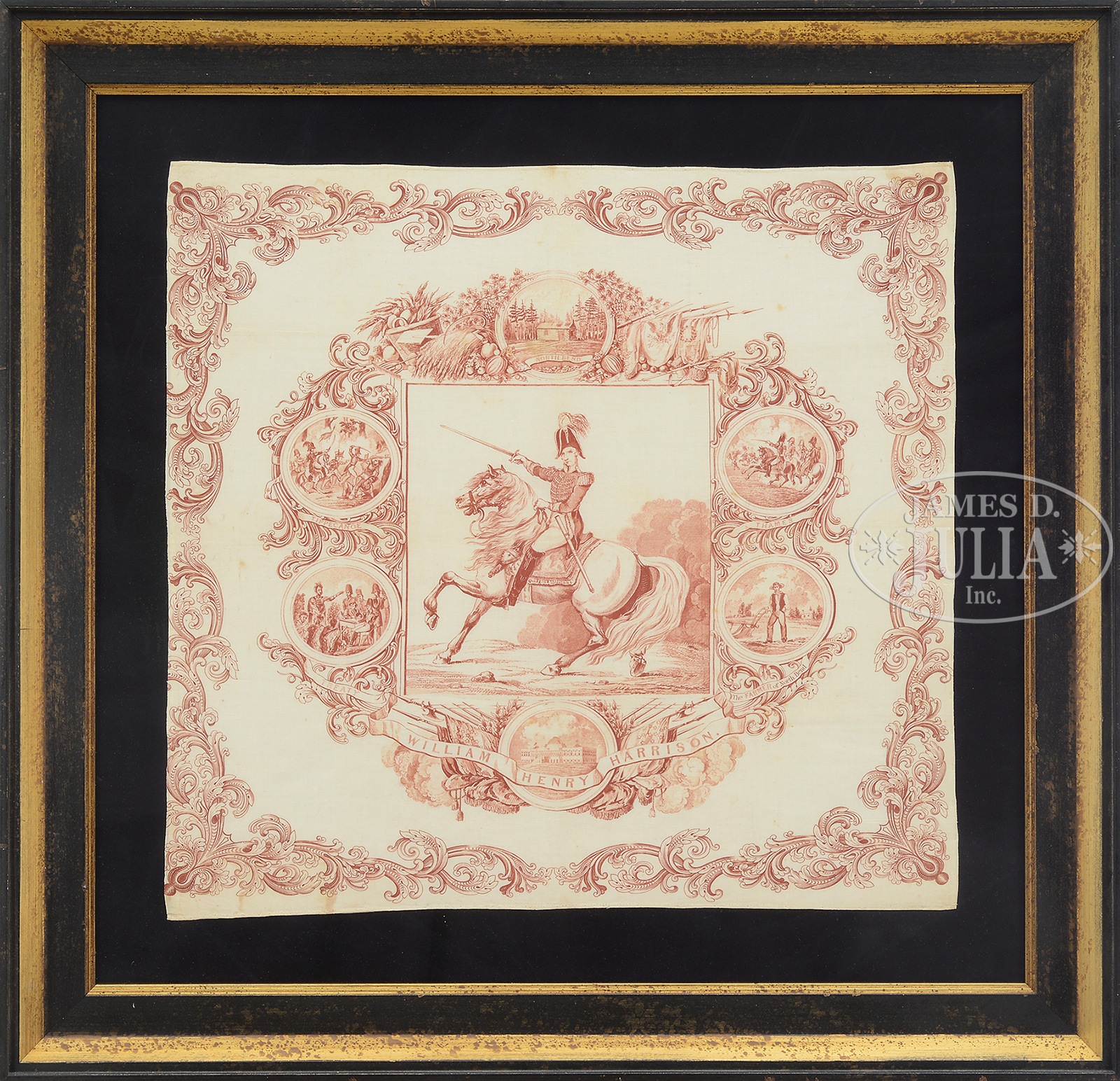 WILLIAM HENRY HARRISON CAMPAIGN OF 1840 GROUPING.This grouping consists of an equestrian bandana, a rare lidded sugar bowl decorated for the campaign and a Sandwich Glass cup plate also decorated with log cabin and Tippecanoe. 1) Printed cotton bandana measures about 27″ x 25-1/2″. Central motif shows Tippecanoe on horse and various vignettes and panoply of arms surround. 2) Lidded sugar bowl issued for 1840 campaign with General Harrison found in 4 separate vignettes, the log cabin at Ft. Meigs, barrels of “HARD CIDER” and other motifs. Base of china has makers stamp and “log cabin” in scrolled pattern. 3) 3-1/2″ Sandwich Glass cup plate with relief log cabin “Tippecanoe, Ft. Meigs, Wm. H. Harrison”. PROVENANCE: From the personal estate collection of John W. Armiger Jr. CONDITION: 1) Very good overall. Light staining, good colors, trimmed on right side with no fimbration. Finely mounted to 38″ x 37″ frame. Additional printed history and provenance found on verso. 2) Chips in lid and small chips in inner ring where lid seats. Light edge wear. About 6-3/4″ long and about 6″ high. 3) Very good. 49055-115 (3,000-4,000) – Lot 2098