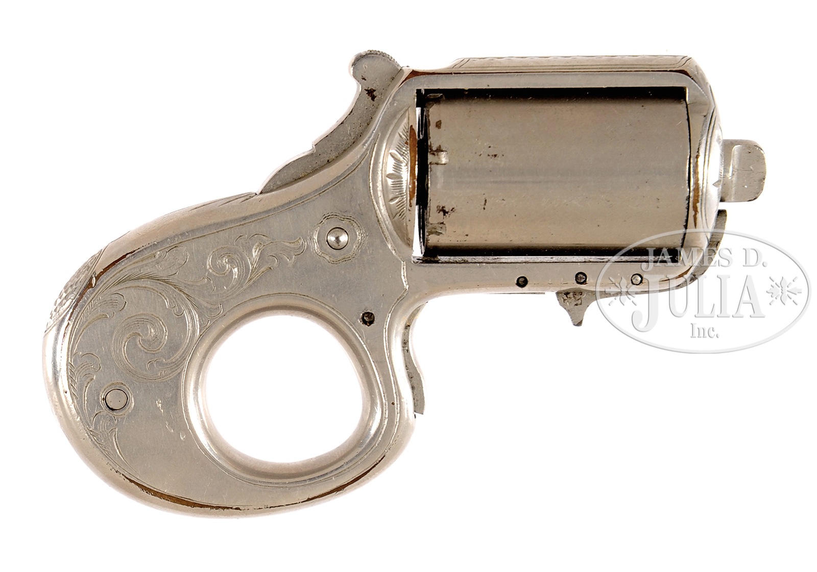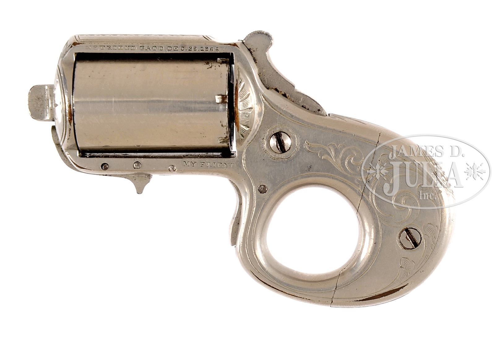 SN 4554. Cal. 22 RF. Brass frame traditional Knuckleduster pattern frame. Broad New York style engraving. Early 3-pin frame with safety device. Double marked “MY FRIEND” below cyl and “MY FRIEND” with patent dates above cyl. Numbers matching gun with numbers found on frame, trigger, safety device, cyl and cyl pin. This gun has right hand cyl pin threads. Very early production. PROVENANCE: The Carmen Gianforte Collection. CONDITION: Superb overall condition, with most all nickel finish remaining. Engraving is well executed and very pleasing. Chambers and mechanics are excellent and functioning inclusive of the safety device. A spectacular example and would be difficult to improve upon and the only one I have seen with the double “MY FRIEND” markings. 50603-19 TDW (1,500-2,500) – Lot 2100