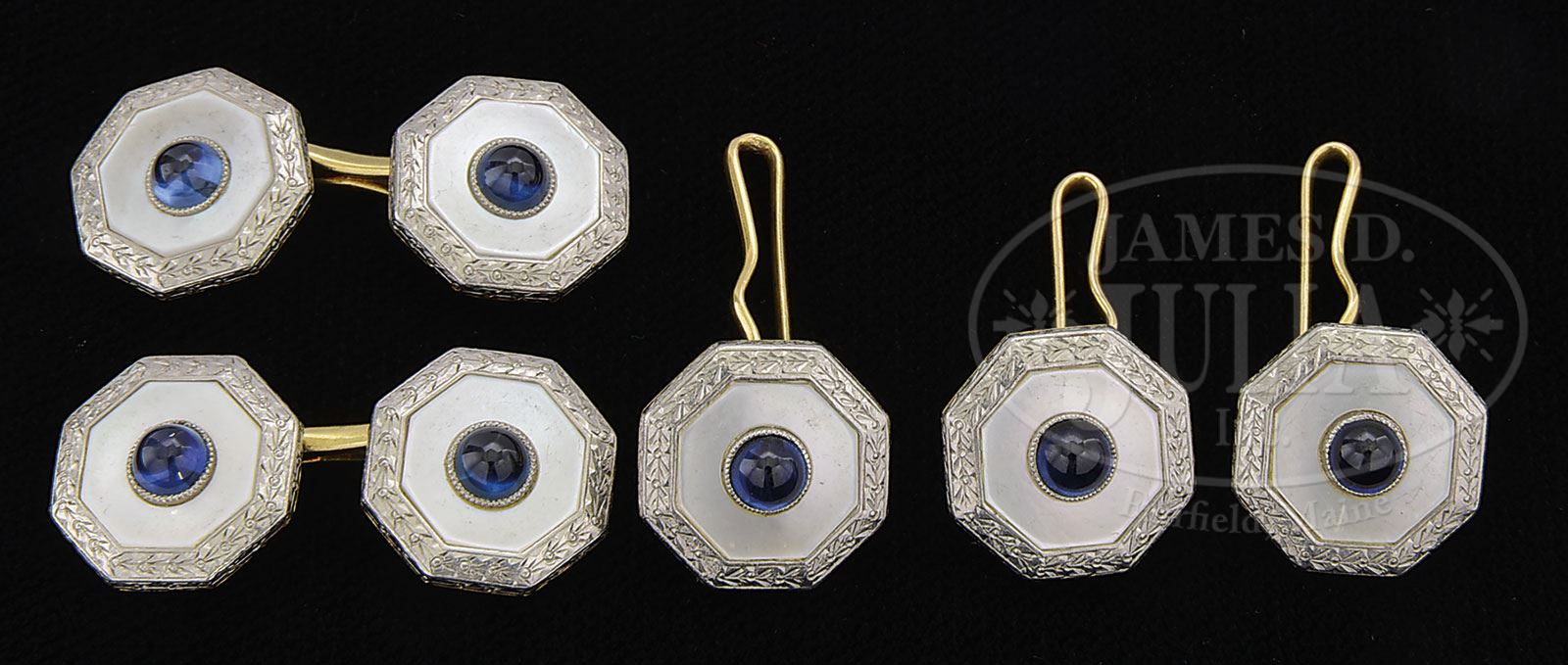 14K GOLD AND PLATINUM CUFF SET.Gentleman’s dress cuff set is 14k yellow gold with platinum tops. Each end is set with mother of pearl and a round blue sapphire cabochon. Set consists of a pair of cuff links and 3 shirt studs. SIZE: Each cuff is approx. 1/2″ across. CONDITION: Very good to excellent. 5-60109 (2,500-2,750) – Lot 2102