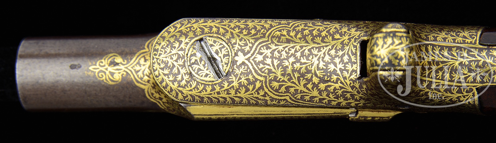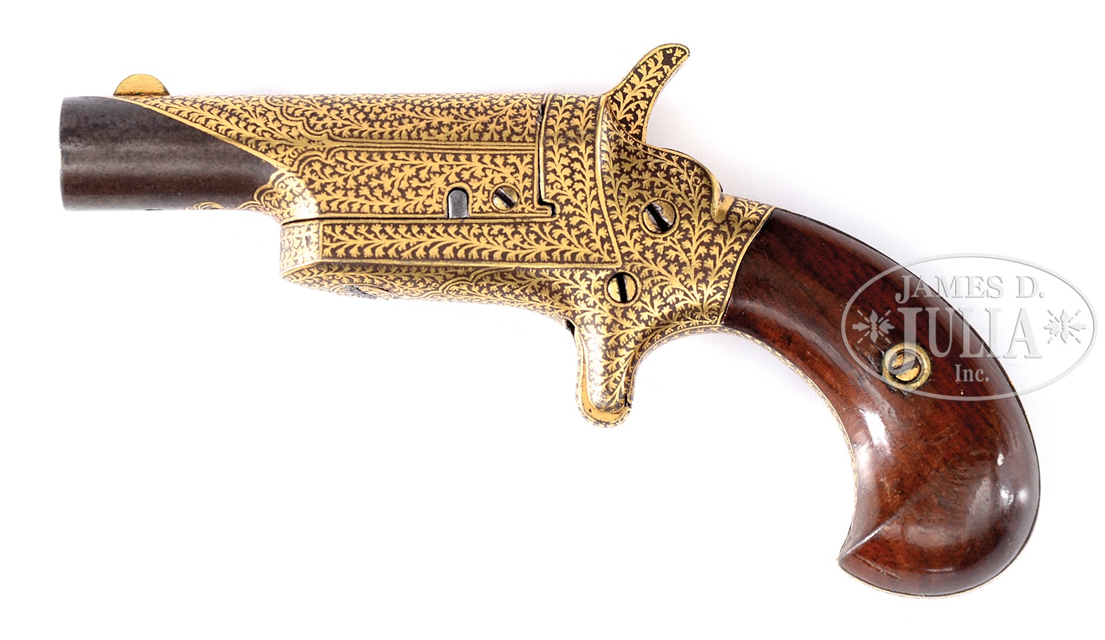VERY RARE FULL DAMASCENED COLT NO. 3 DERRINGER WITH UNIQUE IRON FRAME.SN 28783. Cal 41RF. This exact unique Colt derringer with 2-3/8″ rnd bbl, half moon front sight with large “COLT” on top with dashes and tiny British proofs on the bottom is pictured on pg 142 of Colt Engraving by R.L. Wilson, 1974. Mounted with 2-pc bird head smooth rosewood grips. Pistol has nearly full coverage damascening with the exposed part of the bbl a light chocolate brown. Screw heads, hammer & trigger are all gold plated. According to Doug Eberhart, he knows of no other iron frame Colt No. 3 derringers. Accompanied by a repurposed red & green velvet lined rosewood casing that has an empty German silver oval in the lid and a square lock escutcheon. Interior is French fitted for the pistol, a steel cleaning rod with slotted tip, a tiny pewter oil bottle & has a mahogany cartridge block in the left front containing 6 cartridges. Case is not factory & has been added since published in 1974. Gold damescening is among the rarest embellishments found on London Colts. This gun once in the collection of Glenn Giehart who is known as early collector of gold damascene guns. PROVENANCE: Glenn Giehart Collection; pictured on pg 142 “Colt Engraving” by R.L. Wilson, 1974. CONDITION: Pistol is very fine. Well fit grips are matching numbered to the pistol, frame is not numbered. Overall retains about all of its fine damascene gold with thin brown on the exposed area of the bbl. Grips show light sharp edge wear with a few light nicks and retain most of their orig varnish. Mechanics are crisp. Bright shiny bore, may be unfired. Case is missing a small piece of veneer from the right top edge, otherwise is sound with light nicks & scratches & retains most of its orig varnish. Interior is bright & clean with little or no soil. Accessories are fine. 50140-5 JS104 (20,000-30,000) – Lot 2103