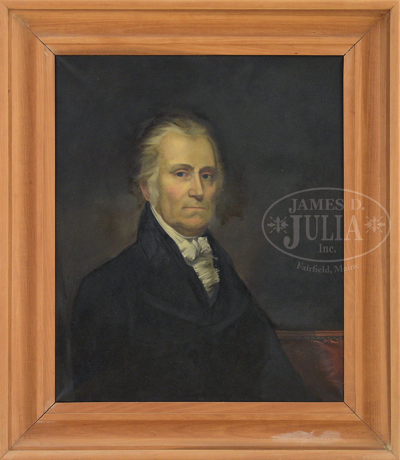 RACHEL & HARVEY DINNERSTEIN (American, 20th/21 Century) PORTRAIT OF JOHN LIVINGSTON.Oil on canvas half portrait of a gentleman wearing black coat seated on a red sofa with a dark background. Housed in a light colored natural heavy molded wood frame. Inscription on verso indicates that this was a copy made by the artist and an early appraisal of Alida Livingston’s property mentions a 19th Century portrait of John Livingston which this painting was copied from. SIZE: 30″ x 25″. Overall: 30-1/2″ x 33-1/2″ PROVENANCE: Original contents from the estate of Louise Alida Livingston, Oyster Bay, L.I., N.Y. Removed from the family home, Greenport L. I., N.Y. CONDITION: Very good. 51941-29 (500-800) – Lot 2107