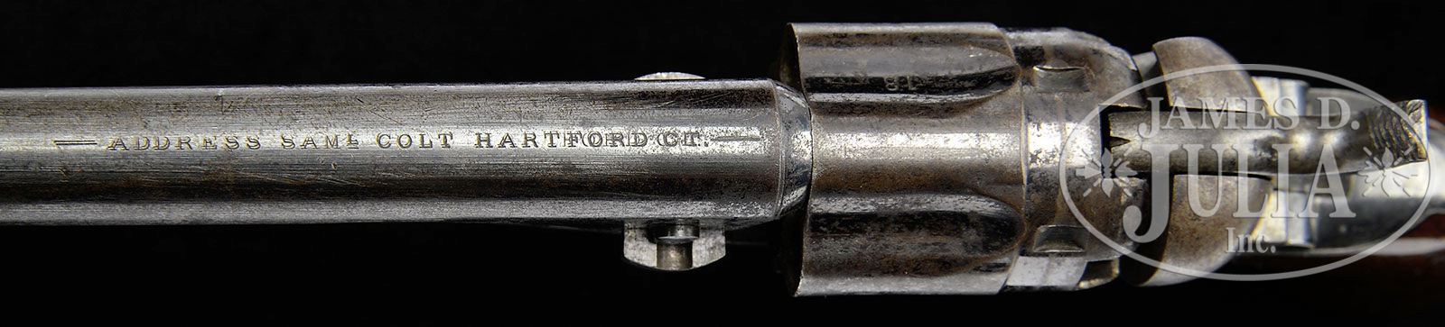 RARE EARLY COL. COLT PRESENTATION COLT MODEL 1862 POLICE PERCUSSION REVOLVER.SN 13. Cal. 36. This is one of the very first 1862s made in 1861 being SN 13. This gun has Colt factory inscription on backstrap “WM. W. MACFARLAND ESQ WITH COL. COLT’S COMPLIMENTS”. Samuel Colt was known to give many guns to constituents and friends or anyone who could help him sell his guns. This is a very rare variant of the 1862 Police revolver as features noted below and this could quite possibly be the last or among the last “Col. Colt” presentations as Samuel Colt died January 1862! Wm. W. McFarland was a trusted Colt family and business Attorney working in Hartford at the time of the presentation. McFarland was witness to two Colt contracts between Elihu Root and General James Ripley in June and August of 1862 for a total of 18,000 Army revolvers withing months of presentation of this earliest of Model 1862 Police Revolvers. This very early pocket police conforms closely to standard production guns with the addition of a SN on the loading arm on left side and lack of caliber markings on trigger guard and lack of Colts patent marking on fame and unusual Hartford address as these guns should have New York addresses. Otherwise this gun conforms to other model 1862 revolvers being blue & color case hardened with 4-5/8″ rnd bbl, brass pin front sight and 1-line Hartford address. Brass trigger guard & backstrap contain a 1-pc varnished walnut grip with last four digits of matching SN in backstrap channel. Cylinder is typical half flutes rebated and has a patent date in one flute. Mr. Flayderman’s tag on this gun, which he must have owned since the 1950s, simply states “V. Rare early 62 Colt”. PROVENANCE: Norm Flayderman Estate Collection. CONDITION: Excellent overall, all matching including wedge. Gun was not disassembled but is no doubt all original and authentic in every regard. Bbl retains about 40-50% orig blue with minor scratches and stains; frame, loading assembly and hammer contain traces of original case colors, with balance silver/grey with staining; cylinder retains about 60% strong blue overall with light drag line. Trigger guard & backstrap retain 60-70% of their original silver plating. Grip is sound and solid and well-fit retaining about 95% of its orig bright varnish. Mechanics are fine, bright shiny bore with crisp rifling. Inscription is easily read with some bubbling of silver as can be seen in photos. 4-51142 JS85 (8,000-12,000) – Lot 2108