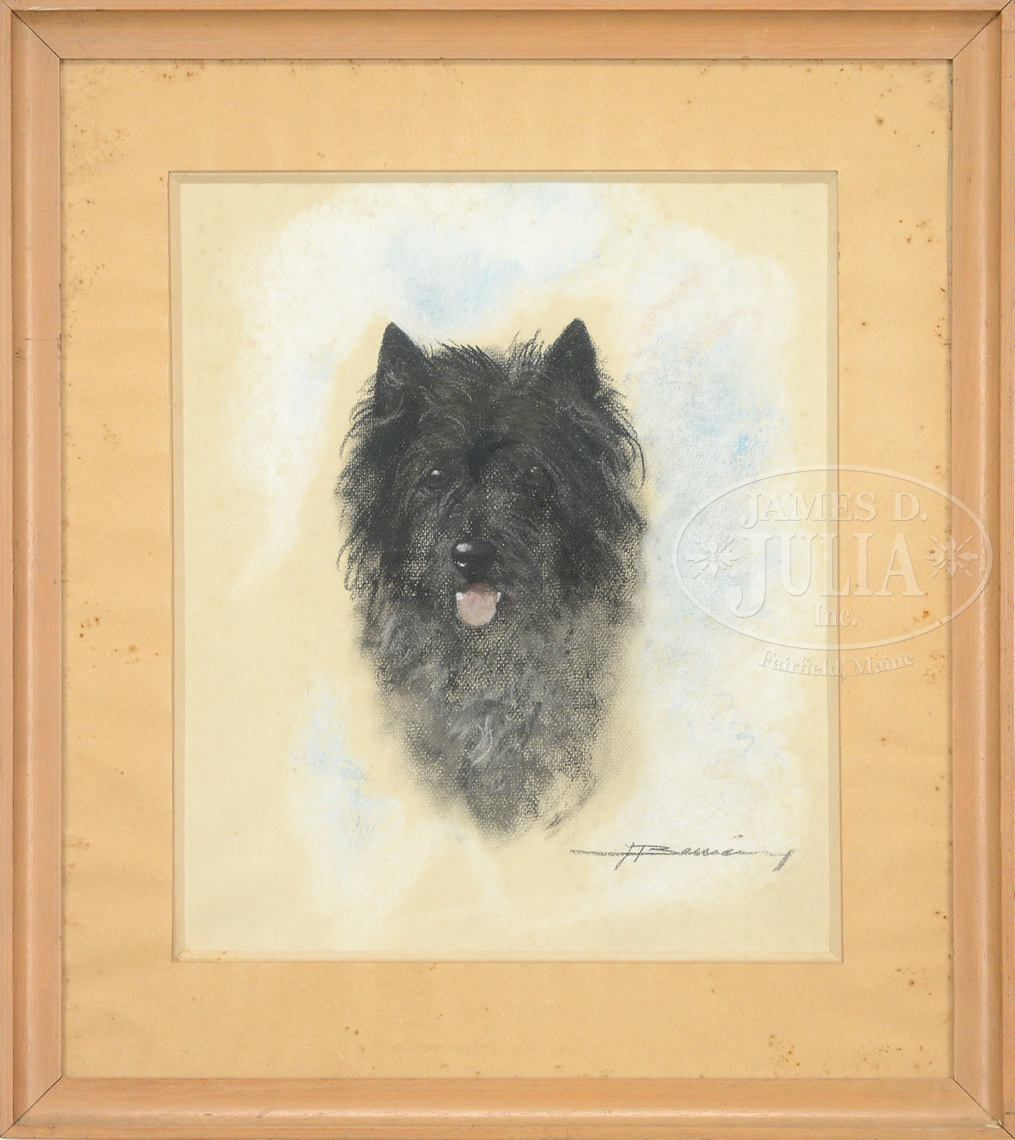 FRENCH SCHOOL (Early 20th Century) FOUR PORTRAIT PASTELS OF TERRIERS.All four framed in wood frames, matted under glass, two bear “R. Osmond, Rue De Vaugirard” labels affixed to verso. Three signed indistinctly lower right, another lower left and dated 24/5/48 1) Two black terriers; 2) Single black terrier; 3) White terrier on grey paper; 4) Black terrier panting SIZE: Sight of all four: 15″ x 12-3/4″. Overall of all four: 22-1/4″ x 19-3/4″ PROVENANCE: Original contents from the estate of Louise Alida Livingston, Oyster Bay, L.I., N.Y. Removed from the family home, Greenport L. I., N.Y. CONDITION: All four having staining on mats, spotting on works and residue on glass 51941-19 (400-600) – Lot 2108