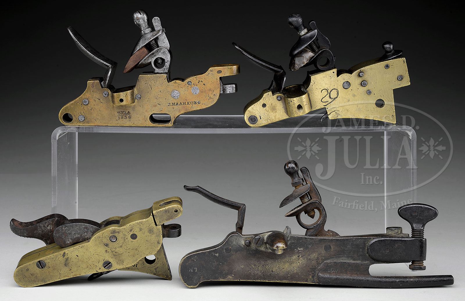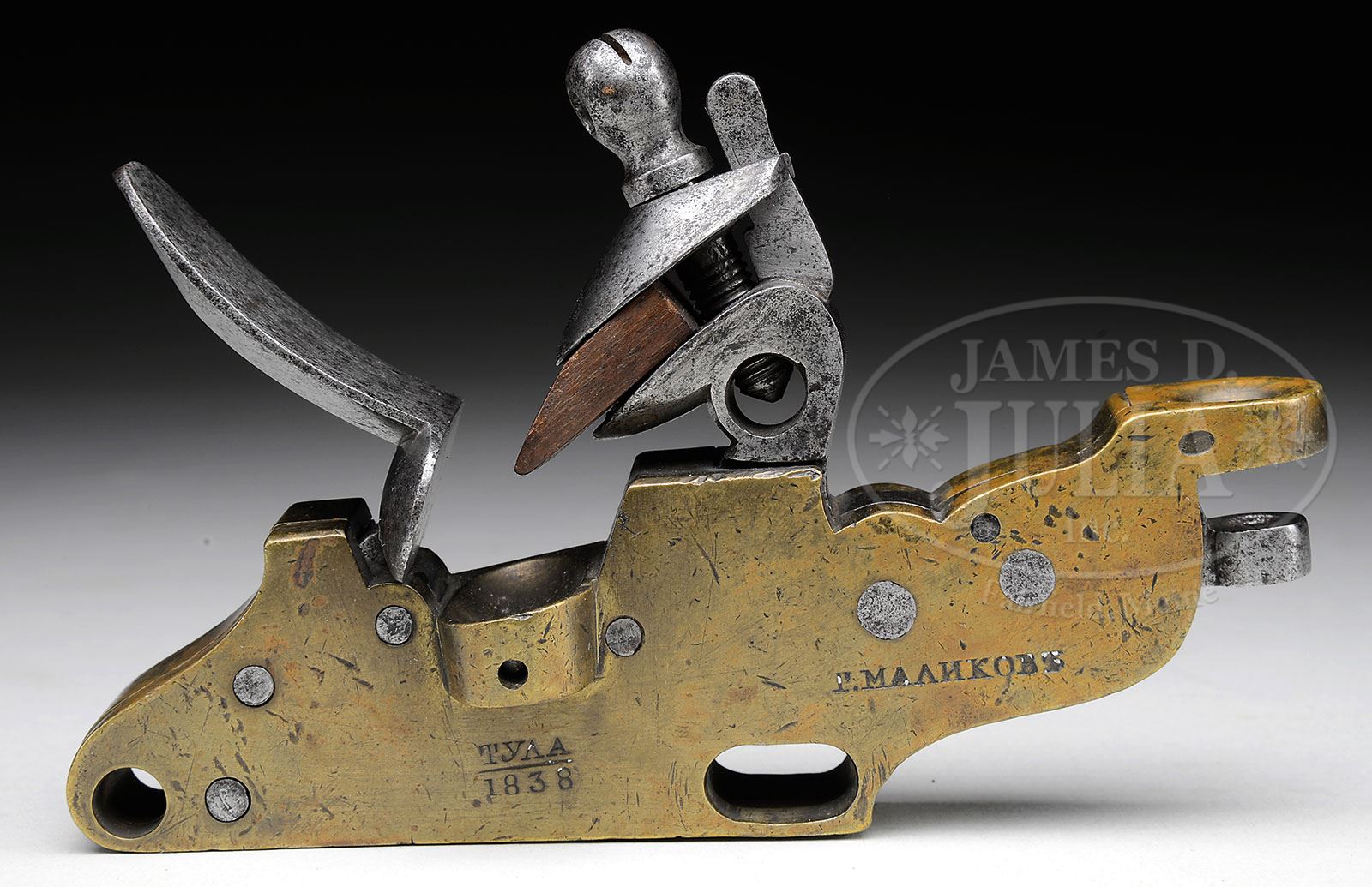 GROUP OF 4 RARE CANNON GUNLOCKS, 2 FRENCH AND 2 RUSSIAN.SN 24348, 25901, 29. Cannon gunlocks are rarely found today as they became obsolete, with the advent of friction primers circa 1850, and most were salvaged for their bronze content. The British Royal Navy first used gunlocks about 1750 but the French did not adopt until the early 19th century. Several of the cannon in this auction made in the late 19th century to early 20th century have mounting holes or platforms for such locks, most of which were intended for naval use. The use of gunlocks had distinct advantages for naval warfare as ignition was rapid and the operator firing gun could stand a safe distance behind cannon such as not to be hit by its recoil by use of long lanyards. Earlier use of linstock limited the distance a gunner could stand, and in a rolling sea, a several second delay made aiming accuracy quite difficult. Every lock in this group is quite different as to design and mounting characteristics. The largest lock in this group, which has an overall length of 9″, is marked “Charleville” and has military inspection on its various parts, a 2-digit number on back “16” with proof, probably represents date of manufacture, 1816. The second French lock, which is marked “BRINGOL A PARIS” is proofed and marked “An 13”. The two Russian locks are quite diverse in their manufacture, though both have same Cyrillic makers mark as can be seen in photos. The flint mechanism being bade in 1838 and the percussion mechanism made in 1839. Both have 5-digit SNs which means the Russians had a lot of cannons in the 1830’s but these are the only two locks we know of. This group would most likely be close to impossible to duplicate again. PROVENANCE: Bill Cobb Collection, Springfield Arsenal, LLC Artillery Collection. CONDITION: Very good overall. All appear functional except Russian dated 1838 flintlock is quite stiff and tight. Markings all discernible. Brass and iron patinas. 4-54185-1 (5,000-10,000) – Lot 2109