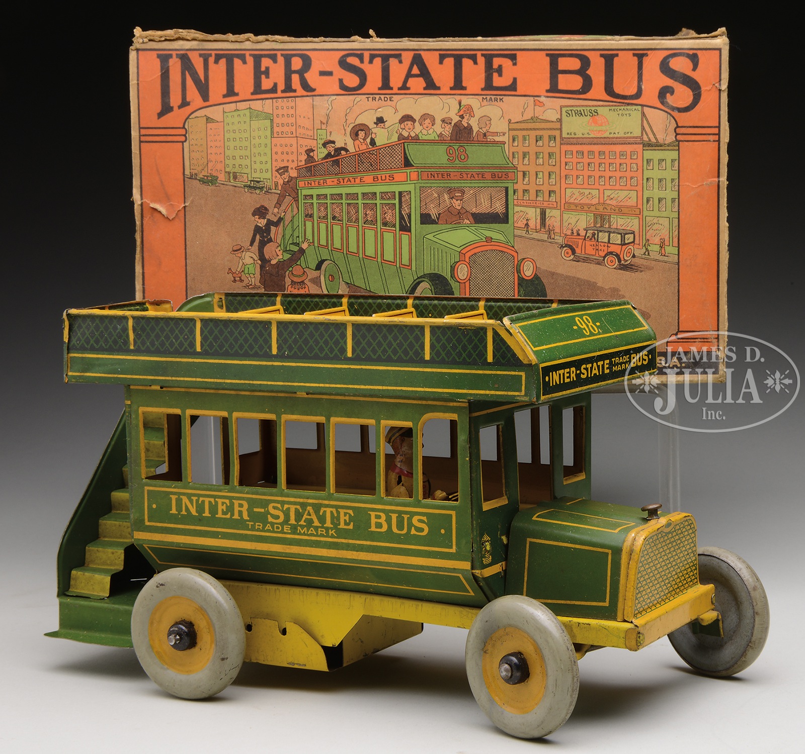 STRAUSS INTER-STATE BUS W/OB.British styled double-decker all tin bus shows well articulated driver on right side. Winding stairway to rear leads to upper deck. Steerable front end. Toy and box are marked Inter-State Bus #98. Quality toy with striking graphics on box. SIZE: 10-1/2″ l. CONDITION: Toy is excellent. Box has all end flaps detached and present – will display well on one side. 18086-25 (300-500) – Lot 2109 Auction: Advertising, Toy & Doll - Spring 2015 Please Note: All prices include the hammer price plus the buyer’s premium, which is paid by the buyer as part of the purchase price. The prices noted here after the auction are considered unofficial and do not become official until after the 46th day. |