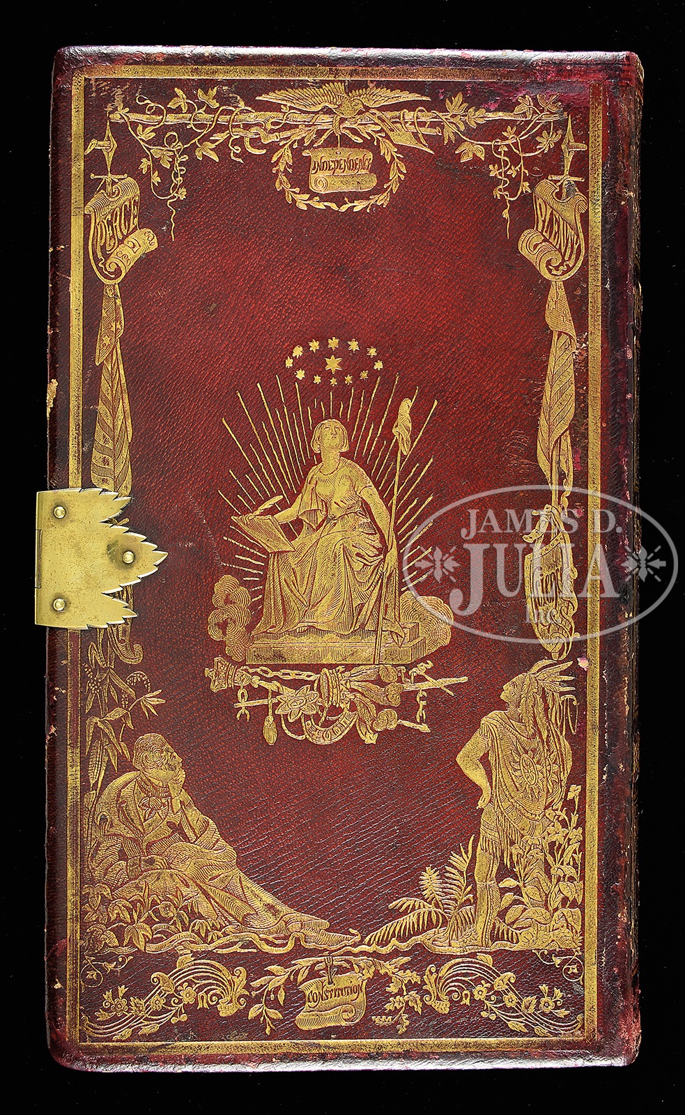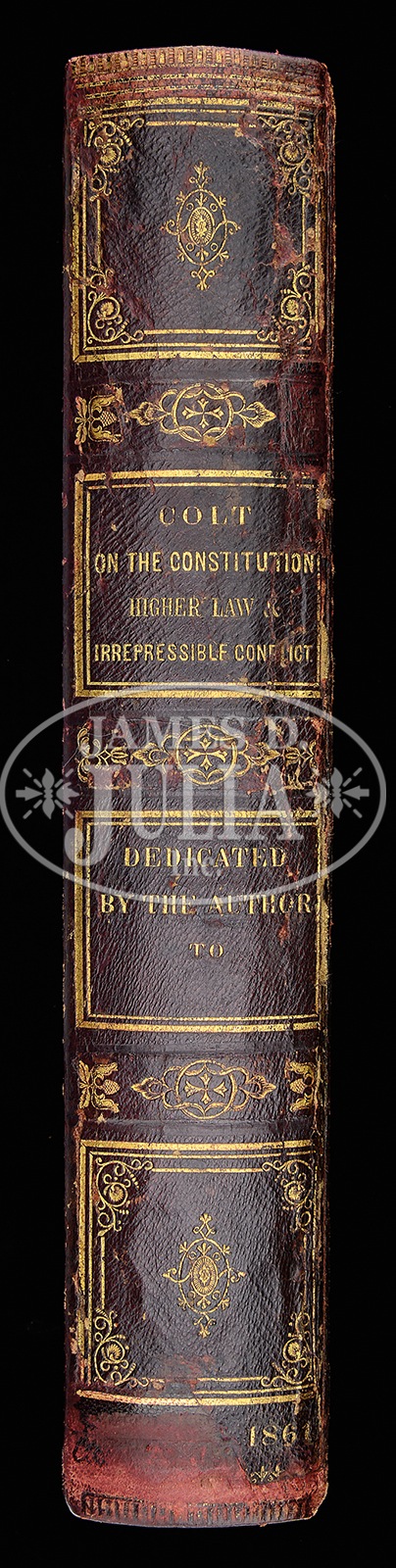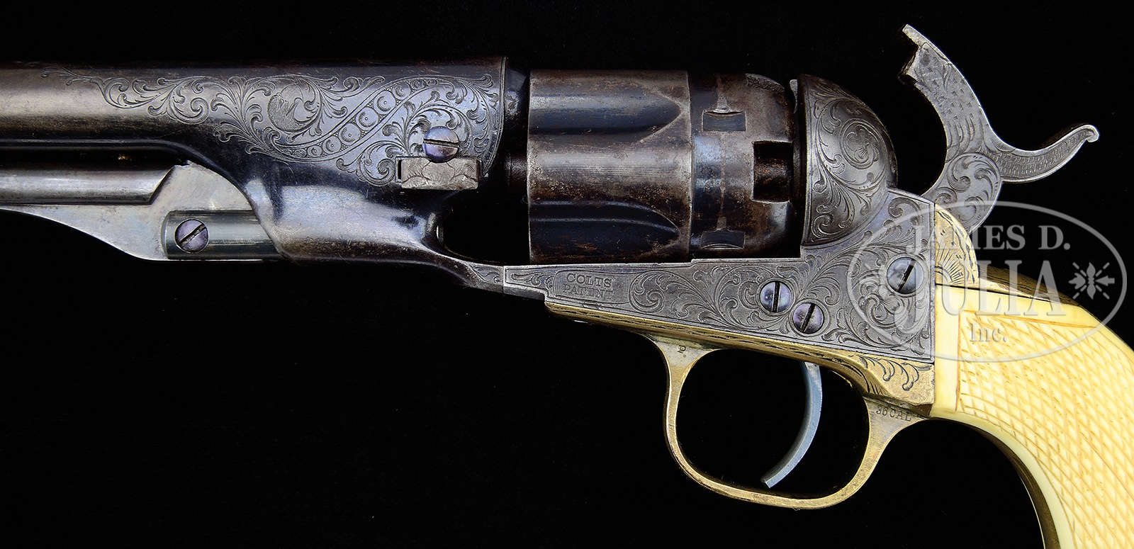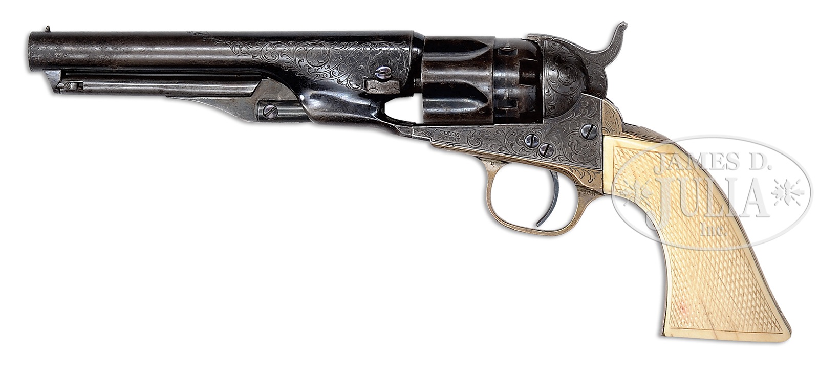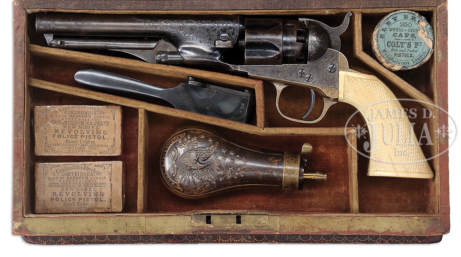 EXTRAORDINARILY RARE ENGRAVED BOOK CASED COLT MODEL 1862 POLICE PERCUSSION REVOLVER.SN 30747 I. Cal 36. Blue and color case hardened with 5-1/2″ rnd bbl, brass pin front sight and 1-line New-York US America address. Left side of frame is marked with a small “COLTS PATENT” and left rear web of trigger guard is marked “36 cal”. Cyl is rebated and half-fluted with 5 chambers. The silver-plated brass trigger guard & backstrap contain a full checkered, 1-pc “certifiable antique elephant ivory” grip with last 3 digits of matching SN in backstrap channel. Grip is made in the orig manner of 2 slabs of ivory attached to an ivory spacer. Revolver is beautifully engraved in late vine pattern without background, probably by Gustave Young with about full coverage on the frame and sides of the hammer. Engraving extends up the sides of the bbl with one scroll on the bbl terminating in Mr. Young’s mythical bird figure, several scrolls on the frame terminate in flower blossoms and the hammer has a wolf’s head on each side of the nose. Top of the backstrap is engraved in Mr. Young’s distinctive fan pattern with other foliate arabesque patterns down the backstrap, on the buttstrap and trigger guard. Accompanied by an extraordinarily rare, incredible book casing that measures 11-1/2″ x 6-5/8″ x 2″, covered in burgundy leather with gold embossing on both covers and the spine. The spine is embossed “COLT / ON THE CONSTITUTION / HIGHER LAW & / IRREPRESSIBLE CONFLICT” and further down is the inscription “DEDICATED / BY THE AUTHOR / TO / ——–“. Bottom of the spine has only the date “1861” visible. The covers are secured by a unique brass latch and a mortised brass lock. Interior is burgundy velvet lined and compartmented in the bottom for the revolver, a single sided “COLTS PATENT” eagle & stars flask, a blued steel bullet & ball “COLT’S PATENT” mold with sprue cutter marked on the right side “36P”, a paper wrapped tin of Ely’s caps with blue label and 2 sealed packets of orig Colt’s Cartridge Works combustible envelope cartridges. There were about 28,000 of this model Colt produced 1861-1873 of which extremely few were engraved and incredibly few are known with this extraordinarily rare casing. These revolvers were produced at a time when the west was very wild and carrying a firearm was expected. Few of these revolvers survive today with any orig finish. Book casings such as found here are only known to a very few exclusive collectors and of those extremely few remain in this fine condition. This set is suitable for the most discriminating collector or museum collection. PROVENANCE: William Meyers Collection; Eric Vaule; The Esteemed Collection of Steve Ardia. Special Note: This item contains or is made of ivory. Do not bid on this lot unless you have read and agreed to our "Ivory Position Statement" and the "Waiver of Legal and Financial Risk to James D. Julia in regards to your Purchase of an Ivory Object." This information is located in the front section of our catalog. CONDITION: Revolver is all matching including wedge, cyl and grip. Bbl retains about 60% glossy orig blue with the balance turning plumy brown with some fine pitting on each side of the muzzle. Frame & hammer retain about 75% faded case colors, stronger on the recoil shields and in sheltered areas. Hammer retains about 80% dark case colors. Screws retain most of their orig fire blue. Cyl retains about 30-40% thin orig blue, strongest in the flutes and rebated area, 3 of the 5 safety pins are serviceable. Trigger guard retains 50-60% orig silver with the front strap a light mustard patina. Backstrap & buttstrap are a dark mustard patina. Grip has a couple of age lines on the bottom edges otherwise is sound, showing very light wear and has a fine golden ivory patina. Mechanics are fine. Brilliant shiny bore with 3 or 4 small spots of pitting. Case is very fine with only light crackling on the hinge and some light chipping on the edges. Bottom of the spine has a 3/4″ x 1″ area of faded color which is now a lighter red. The front, top & bottom edges have darkened gold finish. Inside the lid has faded to a mellow gold color with light soil. The bottom retains dark burgundy in the bottom of the compartments otherwise is also faded to matching color. Flask has a couple of small dents in the back and retains about 60% orig finish. Mold is exceptional and appears to be new and unused. Cap tin is missing part of its paper wrapping with light soil and faded label but appears to be still sealed. Cartridge packets are extremely fine. This is one of the finer book casings to come to market in recent history. 49631-31 JR6 IVORY (75,000-110,000) – Lot 2109A