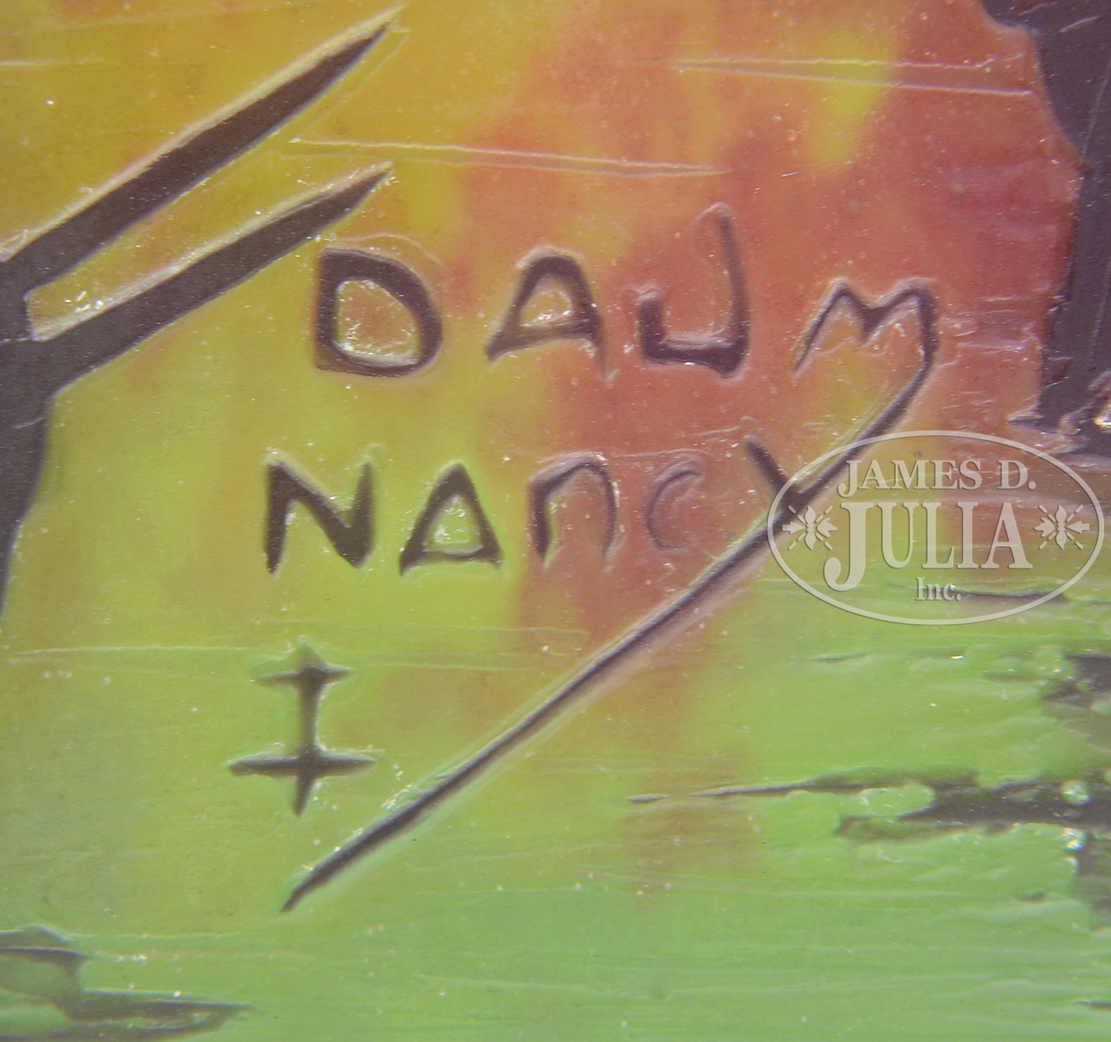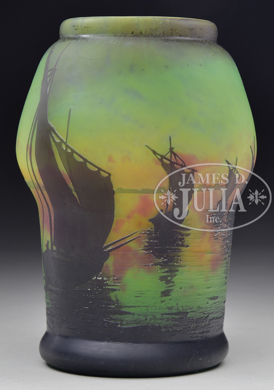 DAUM NAUTICAL VASE.Daum nautical vase has brown cameo decoration of numerous sailboats in a harbor. The boats are set against a green shading to mottled yellow and orange background. Signed on the side in cameo Daum Nancy with the Cross of Lorraine. SIZE: 7-3/4″ t. CONDITION: Very good to excellent. 5-68883 (1,500-2,500) – Lot 2112