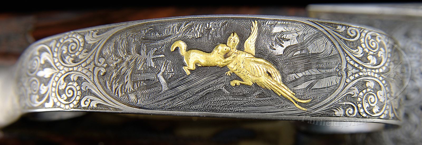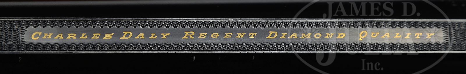 *TRULY EXCEPTIONAL, HIGH ORIGINAL CONDITION, INVESTMENT QUALITY CHARLES DALY REGENT DIAMOND GRADE SEXTUPLE SINGLE BARREL TRAP GUN.SN 26380. Cal. 12 GA 2-3/4″ Chamber. 32″ Bbl with raised, matted, ventilated rib is gold inlaid “Charles Daly Regent Diamond Quality” on unmatted portion. Breech area is relief engraved with exceptionally well carved fern leaves transitioning to well cut open shaded scroll and terminating in small scroll. Witten Excelsior Steel logos are in front of scroll engraving. Bottom of bbl is stamped with steel type, SN, and German imperial proofs with a date of 1/32. Case hardened scallop-backed boxlock action has Daly’s “improved sextuple locking system” which has two sliding bolts in square section action top, which intersect projections on rear of bbl. Action has no safety, and has gold plated trigger. Top fence and side bolsters are relief carved with shell designs at tops and olive leaves and olives along bolsters. Remainder of action is nearly fully engraved with exceptionally well cut, large, open, shaded scroll. This scroll surrounds game scenes in oval vignettes with major subjects relief gold inlaid with exquisite detail. A gold inlaid pointer is standing on rock and pointing on left side of action. Four gold inlaid grouse fly over meadowland on right. Both sides of action are flush gold inlaid “CHARLES DALY”. Bottom of action portrays usual face-on flying duck surmounted by a regents crown, both in full relief gold. Matching scroll engraved trigger guard bow has really cool scene of a gold inlaid weasel attacking a pheasant while it is perched on a branch. SN is in oval device at grip. Beautiful feather crotch figured and strikingly marbled dense European walnut straight grip buttstock measures 14-3/4″ over Silver type pad, and features fancy border checkering at grip with pattern pierced by fleur-di-lis as flush drop points. Side panels are also checkered and have chip-carved borders. A gold oval on toe line is engraved “L”. Matching long slightly flared beavertail ejector forend has Deeley type release. Bore diameter: .740. Bore restrictions: .054 (extra full). Wall thickness: .072. Drop at heel: 1-13/16″, drop at comb: 1-5/8″. Weight: 8 lbs 11 oz. LOP: 14-3/4″. Gun is accompanied by black ABS case with three combination locks embossed “Jaqua’s”. PROVENANCE: The Collection of Robert Burg. Special Note: This item contains or is made of ivory. Do not bid on this lot unless you have read and agreed to our "Ivory Position Statement" and the "Waiver of Legal and Financial Risk to James D. Julia in regards to your Purchase of an Ivory Object." This information is located in the front section of our catalog. CONDITION: Exceptionally fine, near new, retaining nearly all of what appears to be its orig finishes on metal parts, with just a hint of silvering on the sharpest edges of relief engraving on action adding to its depth. Stocks are excellent, retaining most of what appears to be their orig finish with a possibility of light refinish on butt portion, with adjustment of comb and installation of pad. There are only the slightest visible handling marks on wood and metal. All screw heads appear unturned. Mechanically crisp. Undoubtedly one of the finest examples of this rare highest quality Daly gun in existence. Rear bead is “certifiable pre-ban ivory”. 49100-54 MGM264 IVORY (12,500-22,500) – Lot 2113