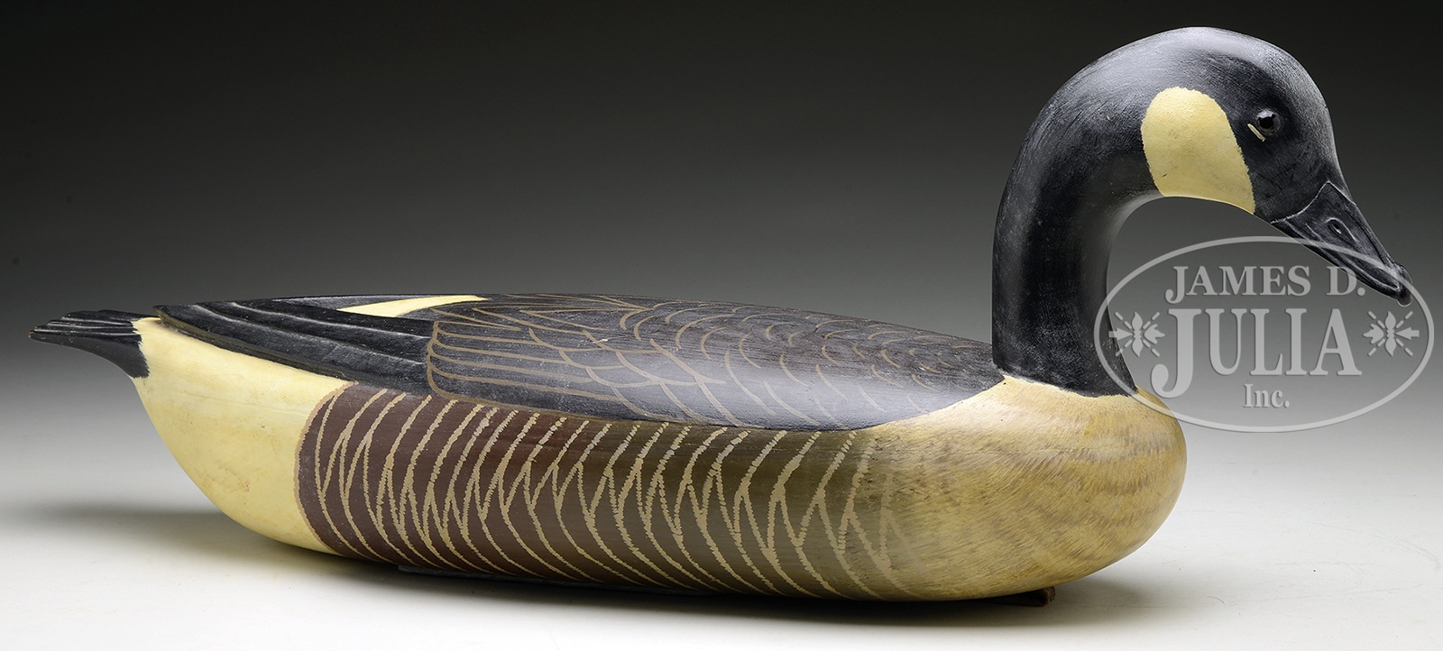 CARVED AND PAINTED CANADIAN GOOSE DECOY BY JOHN G. EGELI II.20th century. New Jersey. Bearing the brass tag of the carver John G. Egeli II, 21 Norman Avenue, Roebling, N.J. (1913-1979). Very well carved with glass eyes, finely detailed bill, and stylized wing and tail feathers. Having fine original paint. Of hollow body form. SIZE: 27″ l. x 10-1/2″ t. CONDITION: Very good. 9-96145 (2,000-3,000) – Lot 2114