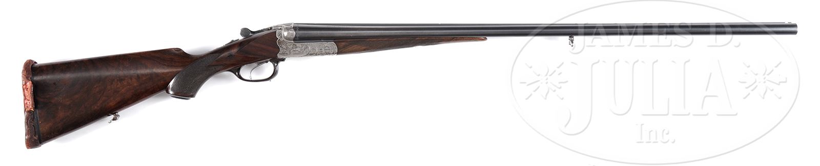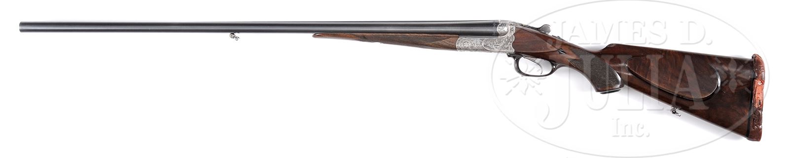 *HIGH QUALITY CHRISTOPH FUNK 20 BORE BOXLOCK EJECTOR SINGLE TRIGGER GAME GUN.SN 37335. Cal. 20 ga. 2-3/4″ Chambers. 29-1/2″ Shoe lump bbls are fitted with matted rib holding two white beads. Tops of bbls are engraved “CHRISTOPH FUNK” and “SUHL”. Bbl flats are stamped with German nitro proofs for 2-3/4″ chambers, with a proof date of 7/34. A sling loop is soldered to bottom rib. Coin finished ogee backed boxlock action features non-automatic safety, crossbolt third fastener, side clips, and single selective trigger with selector on right, similar to that found on L. C. Smith’s. Action is engraved with near full coverage typical Germanic scrolling acanthus in beaded background, along with game scenes on sides and bottom; a trio of rabbits on left, four ducks on right, and three pheasant on bottom. Bottom of action is also stamped with Funk triangular logo, which can also be found on left side of rear bbl lump. Top lever is gold inlaid with monogram “LG” and “1”. Trigger guard is of horn. Well marbled and nicely figured European walnut horn capped pistol grip buttstock measures 13-5/8″ over old red pad, and features right hand shadow line cheekpiece, nicely fluted comb, point pattern checkering at grip, inset horn diamond drop points, and a sling loop on toe line. Matching splinter ejector forend has Deeley release. Bore diameter: left -.627, right -.626. Bore restrictions: left -.026 (full), right -.023 (Imod). Wall thickness: left -.027, right -.029. Drop at heel: 2-1/2″, drop at comb: 1-7/16″. Weight: 6 lbs 5 oz. LOP: 13-5/8″. CONDITION: Very good. Bbls retain most of what may be orig blue, considerably thinned along sides from normal hand wear. Coin finish of action remains bright overall. Stocks retain most of what appears to be their orig oil finish with numerous heavy and light marks, nicks, and scratches, checkering somewhat worn. Pad has melted. Bores are excellent with some light striations. Action is tight. Bbls are on face. 49445-2 MGM370 (2,500-4,500) – Lot 2115