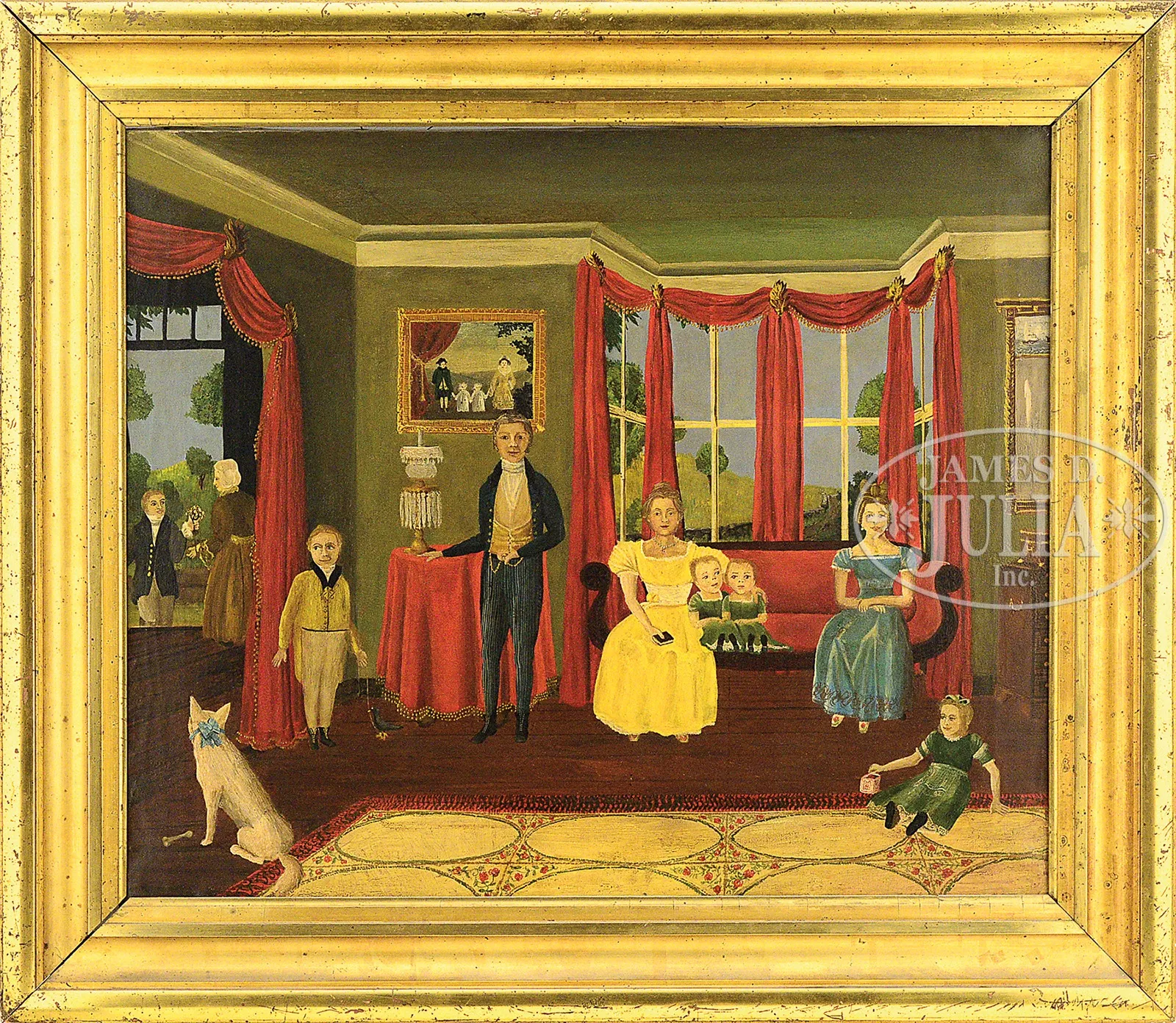 AMERICAN SCHOOL (19th/20th Century) FOLK ART PORTRAIT OF A FAMILY IN INTERIOR.Oil on canvas depicting a family from the late 19th century situated in their well appointed parlor. The scene tells a wonderful story of a suitor coming to call on the eldest daughter and includes the father standing by a table draped in red fabric with a crystal oil lamp and a family portrait on the wall behind him. Mother, wearing a bright yellow dress, is seated on a red upholstered sofa with a set of twins next to her, while the eldest daughter, dressed in a blue dress, is sitting at the opposite end of the sofa with a look of anticipation on her face. A young child wearing a green dress is playing at her feet on a needlepoint carpet and a young lad with a bird on a string stands near the door with the family dog watching as grandmother opens the door to welcome a suitor holding a bouquet of flowers. Housed in a carved giltwood frame. SIZE: 25″ x 30″. Overall: 32-1/2″ x 37-1/2″. PROVENANCE: The Estates of Faye G. Montell & Hayden Goldberg of Brooklyn, NY & Gardiner, ME. CONDITION: Good with minor shrinkage cracks, small patches on verso, inscribed on verso “Cleaned and revarnished, NYC 1938” and inscribed on stretcher “For Mr. Bartlett”. 49830-7 (4,000-6,000) – Lot 2115