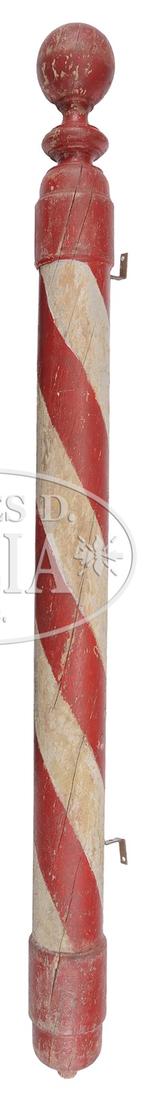 RED AND WHITE BALL TOP BARBER’S POLE.Large size red and white striped with old paint, having two recent metal brackets attached. SIZE: 72″ h. PROVENANCE: From the personal estate collection of John W. Armiger Jr. CONDITION: Old age cracks and some loss of paint surface. 49055-208 (800-1,200) – Lot 2116