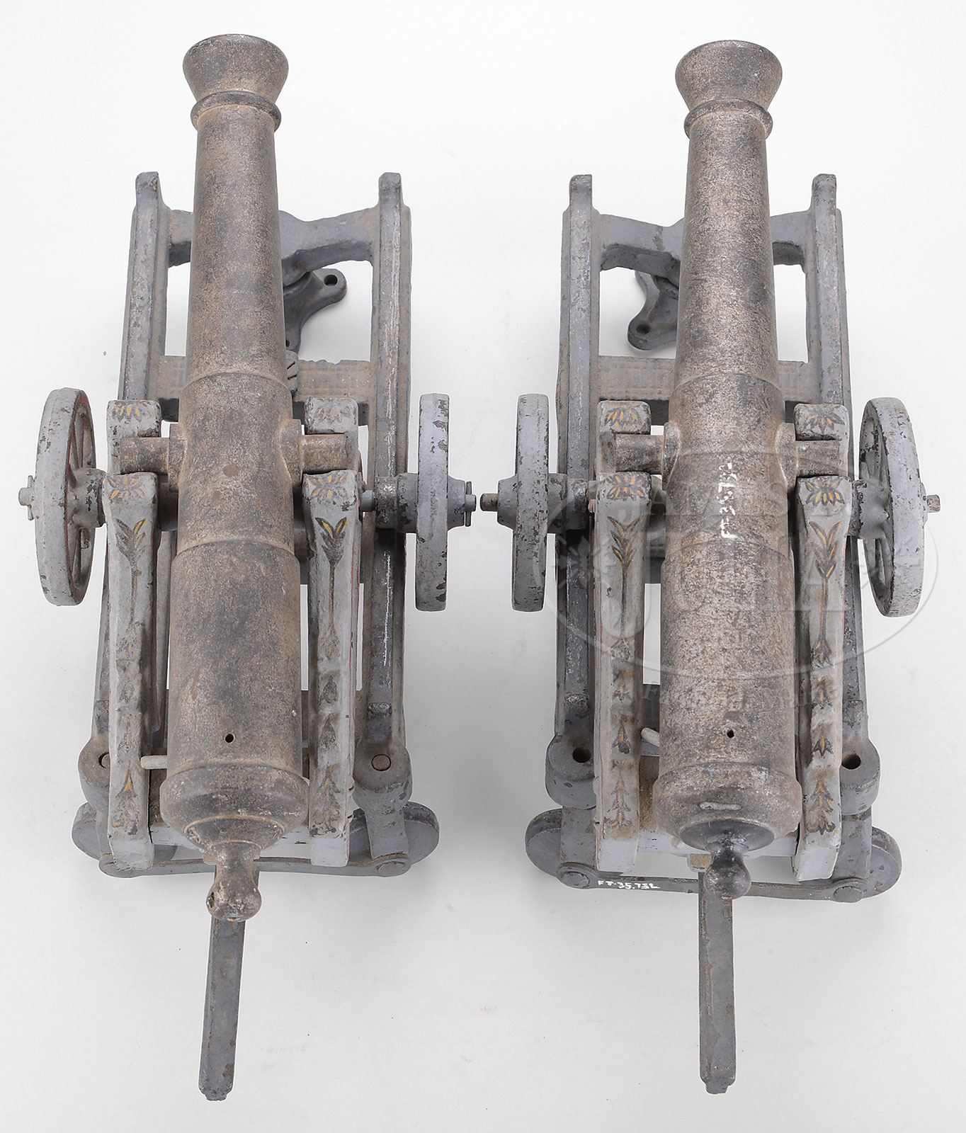 PAIR OF LATE 19th CENTURY CAST IRON TOY SEACOAST GUNS ON CARRIAGES.This well-made pair of cannon appear functional with clear vents & bores on cast iron wheeled mounts that slide on 2-wheel carriages with platform front mount. Extended models are 19″ overall x 6″ w, bbls are 12″ overall from cascabel to muzzle. There are no discernible markings other than painted decorations. Construction is totally metal with the exception of some wooden reinforcements on carriage supports. Carriage & sled design are similar to drawings and photographs of seacoast cannon in fortifications, circa 1850-1870. PROVENANCE: Springfield Arsenal, LLC Artillery Collection. CONDITION: Sound & solid, very good overall, iron bbls originally hard metal plated retaining maybe 20% with the balance being iron patina. Cast iron or pot metal carriages are sound, solid & complete, with grey paint and other painted highlights as can be seen in photographs. One gun has shorter cascabel than the other, otherwise a matching pair. 4-54125 (2,000-3,000) – Lot 2118