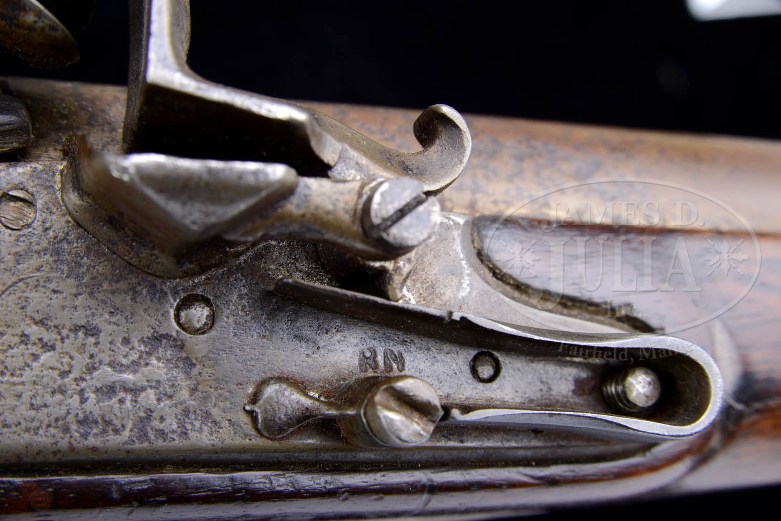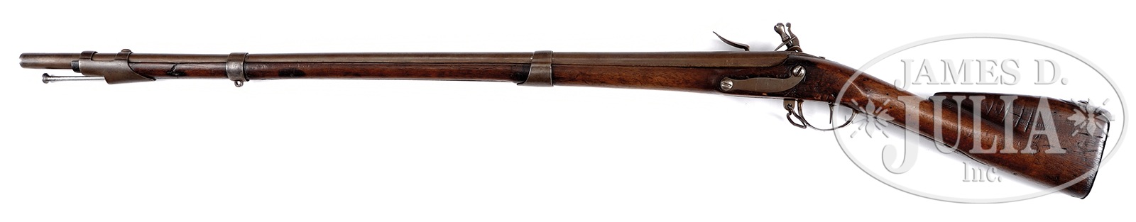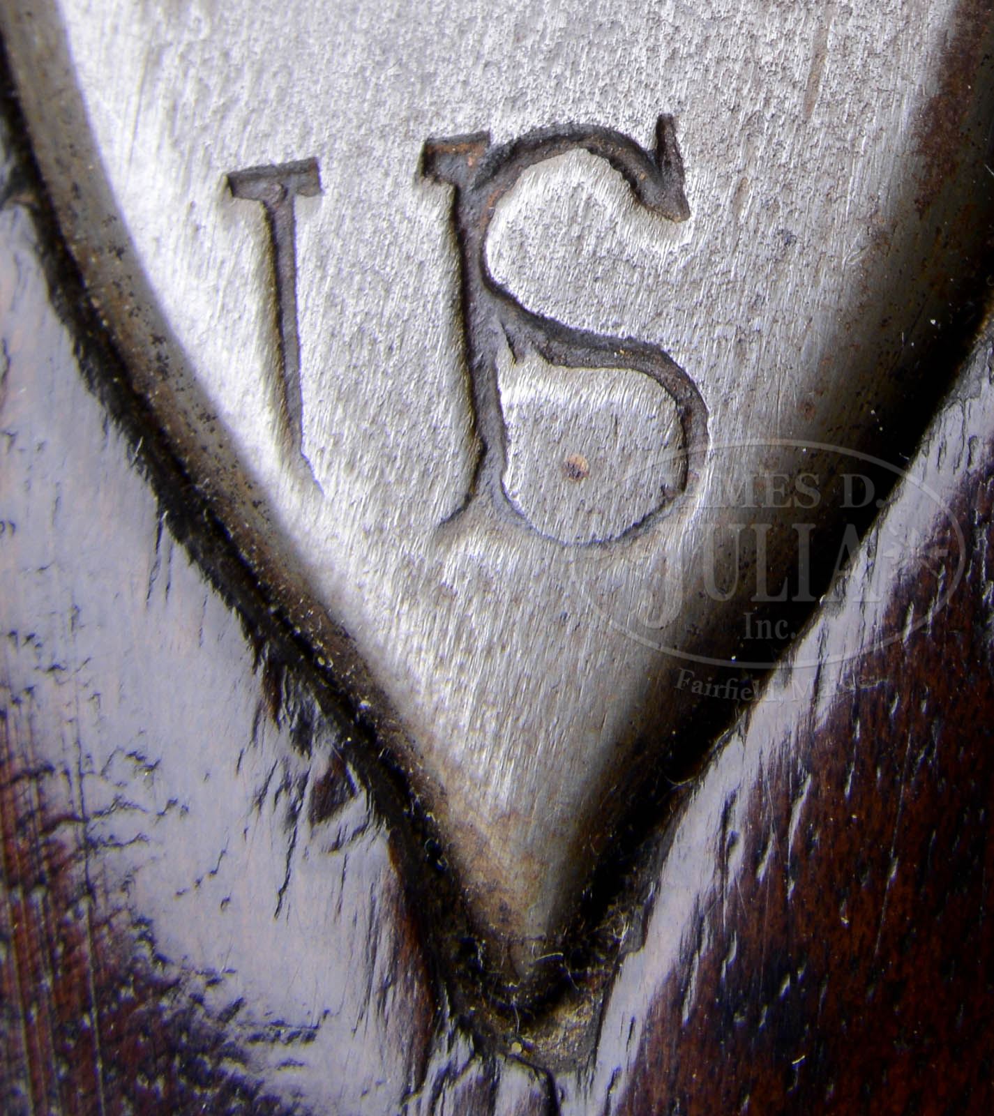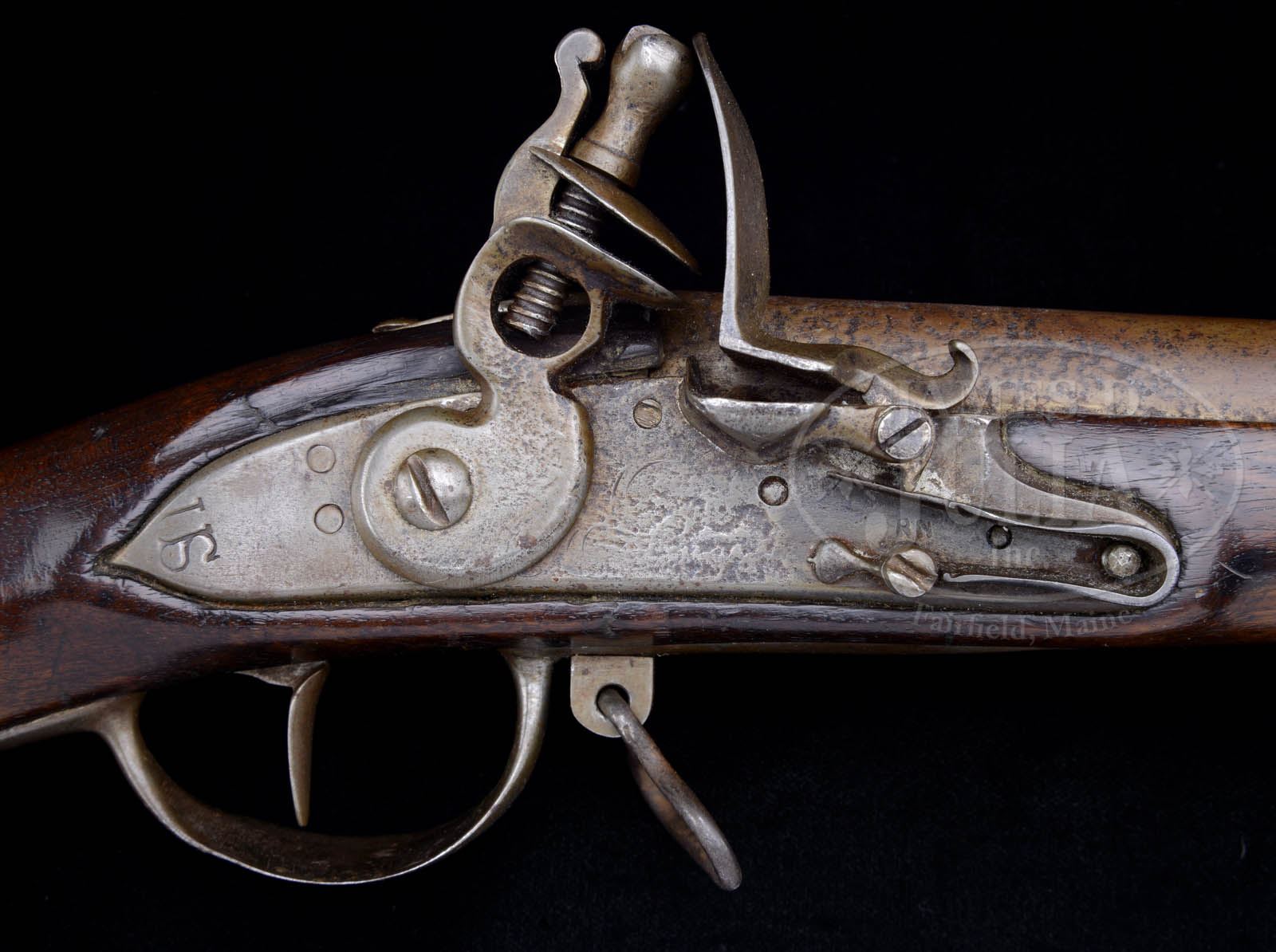 MODEL 1763 US SURCHARGED CHARLEVILLE REVOLUTIONARY WAR MUSKET.SN NSN. Cal. 74. Standard 1763 Charleville musket with US surcharged lock. There is a brand on left side of buttstock “IN”, probably for American who repaired this gun for continued use. George D. Moller in his text American Military Shoulder Arms Vol I lists a possible candidate as John Nicholson who was a known Continental Contract Armorer and also repaired guns in Philadelphia, post-Revolution. The “IN” marking appears quite similar to the “IP” of Joseph Perkins who also contracted in the same time periods on same guns. CONDITION: Gun appears overall orig, though sideplate appears to be restoration. Metal pitted, cleaned and re-colored. 37-5/8″ rnd bbl with barely discernible traces of markings at breech. Bayonet lug missing. Stock sound, refinished with crack between front bands, old carved initials, “V” & “IN” surcharges weak but discernible. 50971-1 JS (6,000-8,000) – Lot 2118 Click here to view provenance