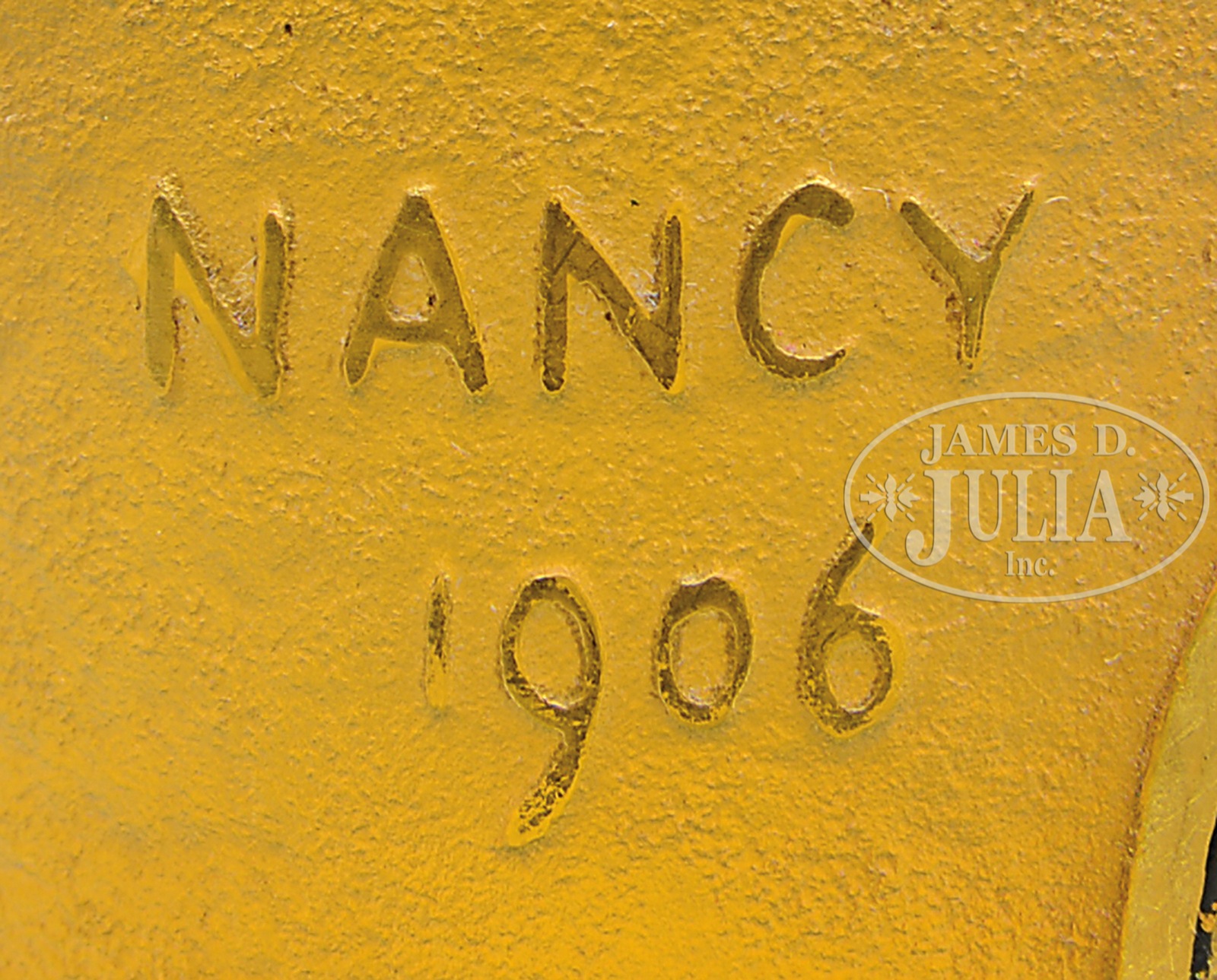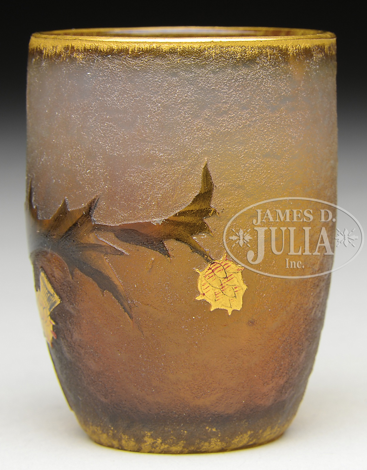 DAUM MINI TUMBLER.Daum miniature tumbler is decorated with cameo thistle design with gold highlights. To the side of the thistle is a gold oval with a silver Cross of Lorraine in the center. Next to the oval is inscribed in gilded cameo “Nancy 1906”. All set against a frosted amber background. Signed on the underside in gold “Daum Nancy” with the Cross of Lorraine. SIZE: 2″ t. CONDITION: Very good to excellent. 5-69038 (800-1,200) – Lot 2121