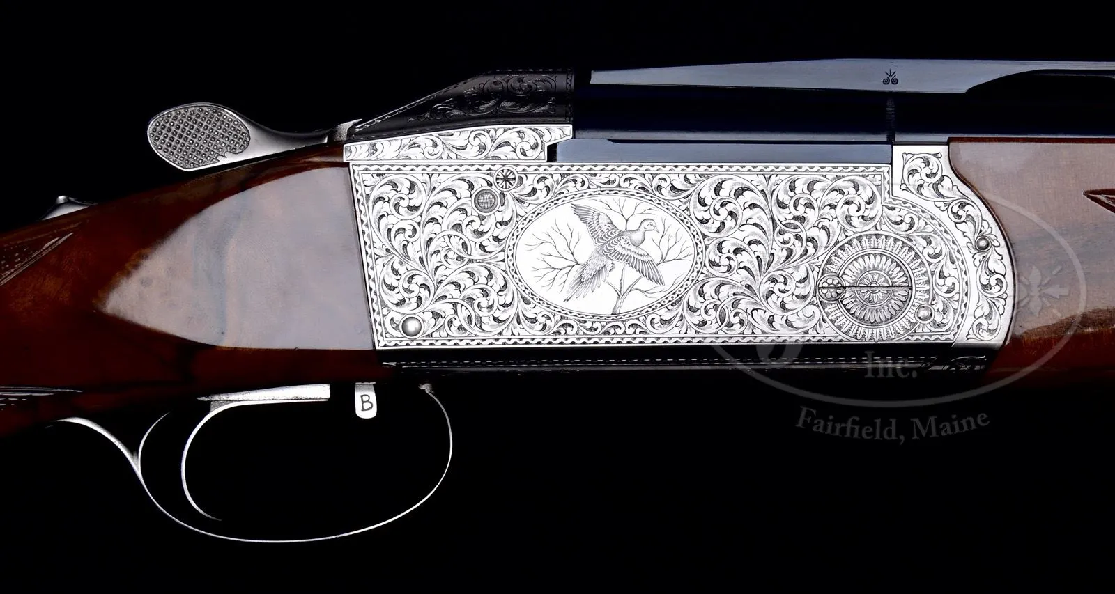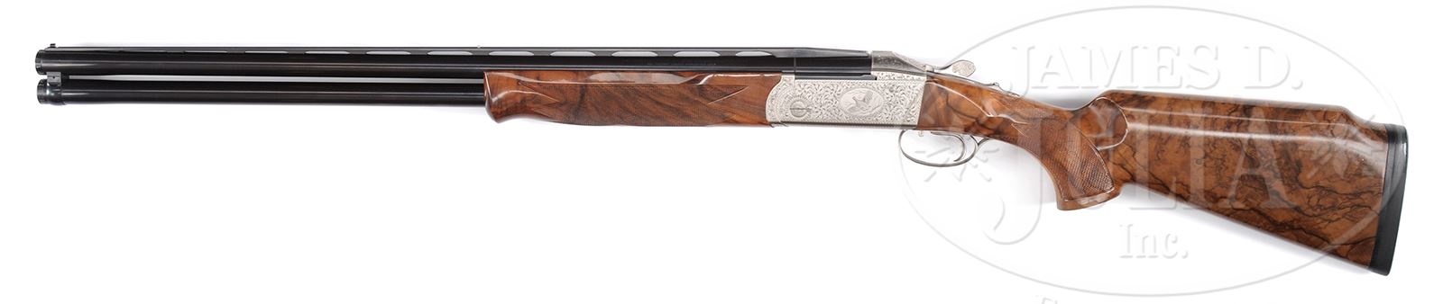 *KRIEGHOFF K80 UPLANDER ENGRAVED BY BADILINI WITH CASE.SN 001661. Cal. 12 ga.3″ Chambers. 28″ Separated mono-bloc bbls fitted with raised, matted rib are marked with instruction information on top bbl and Krieghoff information on bottom of mono-bloc. Bbls are fitted with Krieghoff choke tubes. Nickel-plated K80 action with single selective trigger and non-automatic safety is engraved with near full coverage well cut large scrolling acanthus, as background for oval scenes of flying game birds; partridge on left side of action, and dove on right. Bottom of action is marked “K-80” “KRIEGHOFF” “GERMANY”. Engravers signature “Badilini” is on trigger plate. Exceptionally well figured and marbled European walnut ambidextrous pistol grip Monte Carlo stock measures 14-5/8″ over “Decelerator” sporting clays pad. Drop at heel: 2-5/8″, drop at rear of Monte Carlo: 1-7/8″, drop at comb: 1-3/8″. Weight: 8 lbs 2 oz. LOP: 14-5/8″. Krieghoff marked aluminum Americase is lined in royal blue deep pile velvet with “Krieghoff A Tradition of Performance” embroidered in lid. Case contains three choke tubes (two additional in gun) with wrench and stock removal tool. CONDITION: Excellent, near new, appears to have been fired very little since proof, with slight cartridge halos through damascening on breechface. There are a few light handling marks overall, most notably some small dents and pecks on rear of Monte Carlo. Action is tight. Mechanically crisp. Case has some scuffs and marks on exterior. Interior velvet shows compressions and rubs. 49305-15 MGM145 (8,000-12,000) – Lot 2121