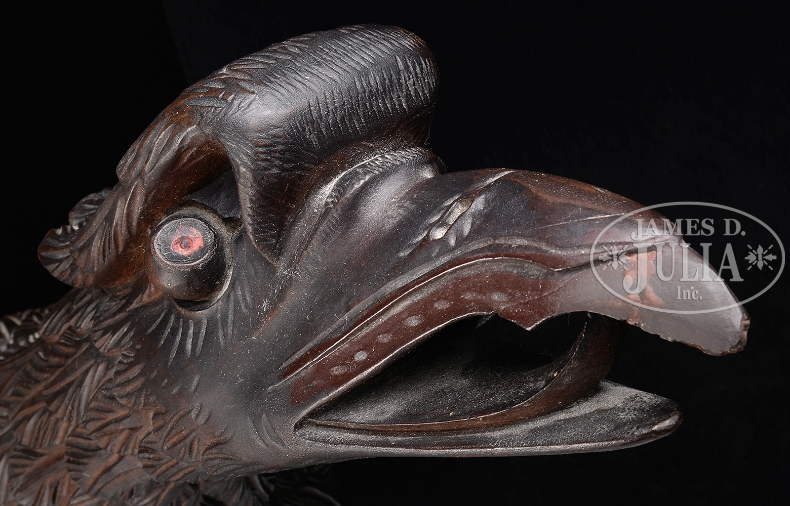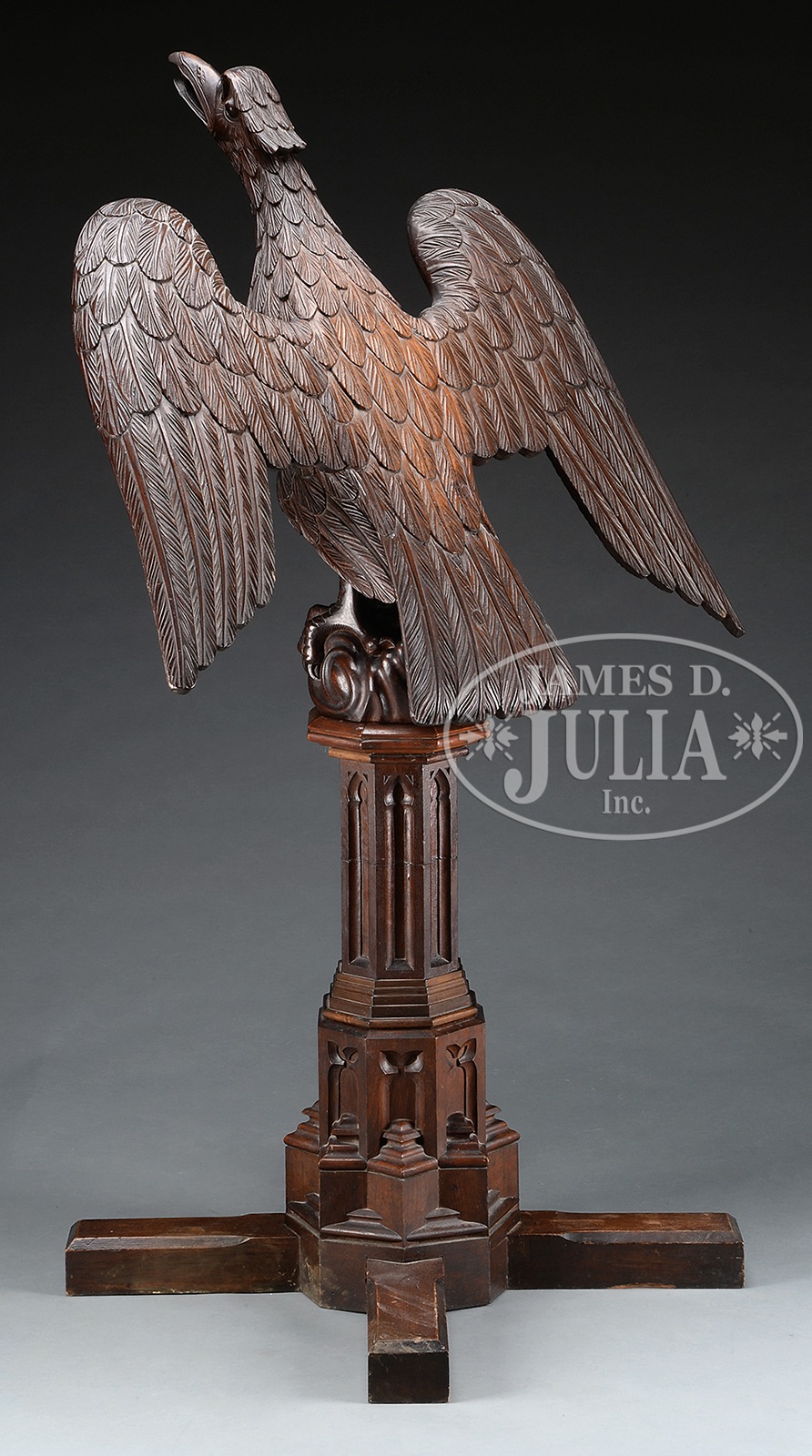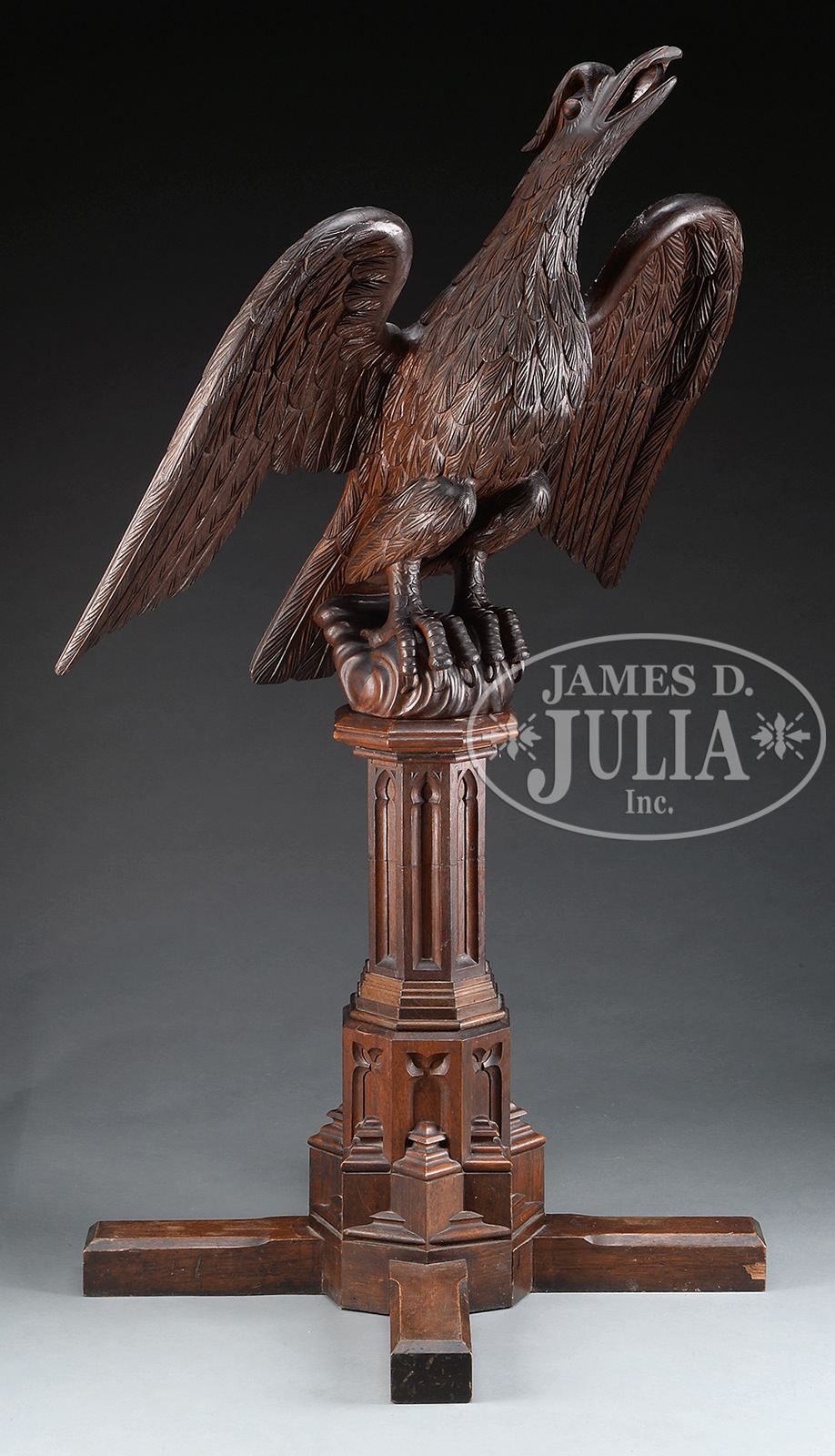 EXCEPTIONAL CARVED WALNUT ARCHITECTURAL EAGLE ON PEDESTAL.Third quarter 19th century, American. The classical spreadwing eagle carved in deep relief perched on rockwork mounted to a molded and faceted aesthetic movement pedestal mounted on an X-form base. Used as a patriotic symbol in an upstate New York courthouse from which it was found. SIZE: 61-1/2″ h x 36″ w x 34″ d. CONDITION: Carving retains all original surfaces with rich dark patina and dark tea brown coloration. Very fine overall. 50499-7 (20,000-25,000) – Lot 2123