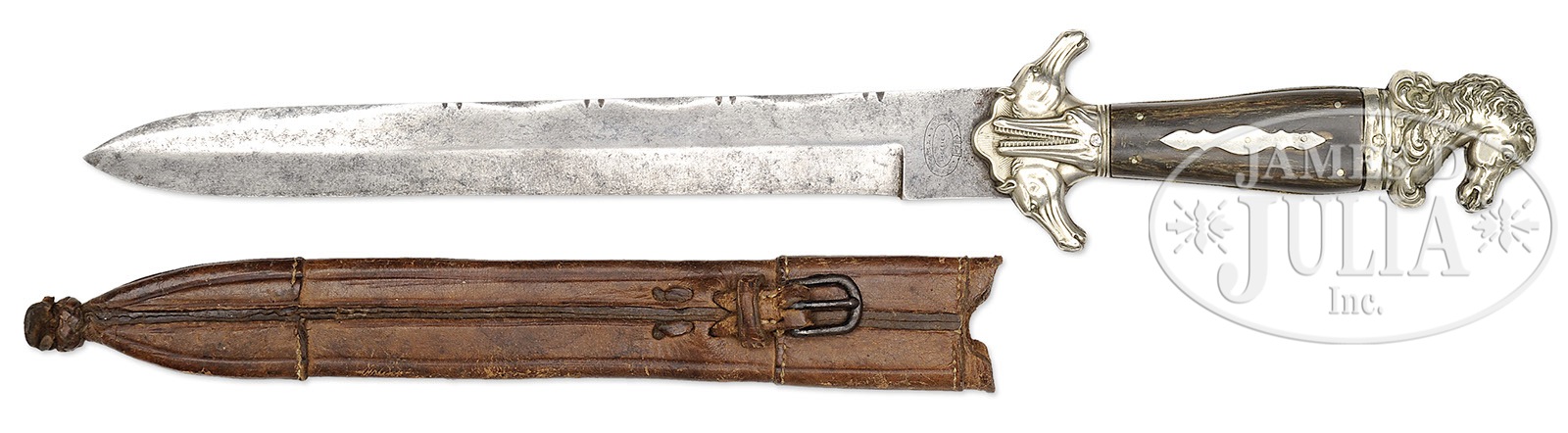 RARE SHEFFIELD BOWIE WITH HORSE HEADS AND ALLIGATOR.SN NSN. This is a very rare form with no more than a few examples exhibiting horse head pommel and unique matching horse heads facing apart with an open jawed alligator head between them. Flayderman in his text shows a large Unwin & Rogers folder on p 436. This massive knife measures 19″ overall with a blade just over one foot. Blade is maker marked “J. Nowill & Sons/Sheffield” in a buckled ribbon cartouche on ricasso. John Nowill & Sons was a noted Sheffield cutler who is known to have been in business in the late 1840’s. If you ever wanted a knife of this configuration this may be your only chance. PROVENANCE: Norm Flayderman Estate Collection. CONDITION: Knife is good to very good overall with gray blade with old sharpening with scattered staining and pitting. Maker’s mark and cryptics on ricasso are easily discernible as can be seen in photographs. Stamped escutcheons on pommel are slightly loose with scattered dents and dings and at least one small area where lead filler can be seen through the thin German silver shell. The crossguard escutcheons are tightly fit with a few dings and dents. Escutcheon retaining pins show denting where they were apparently hammered, possibly to tighten looseness. Horn slabs are both sound and intact with the typical “over-sized” fit often seen in these early Sheffield knives. Silver escutcheon is intact and well fit with about a 5% loss to one edge as can be seen in photos. The accompanying leather scabbard has about 1/4″ gap and though appears possibly 19th century, was probably made later for continued use of this knife. 4-51209 JS2 (10,000-15,000) – Lot 2124