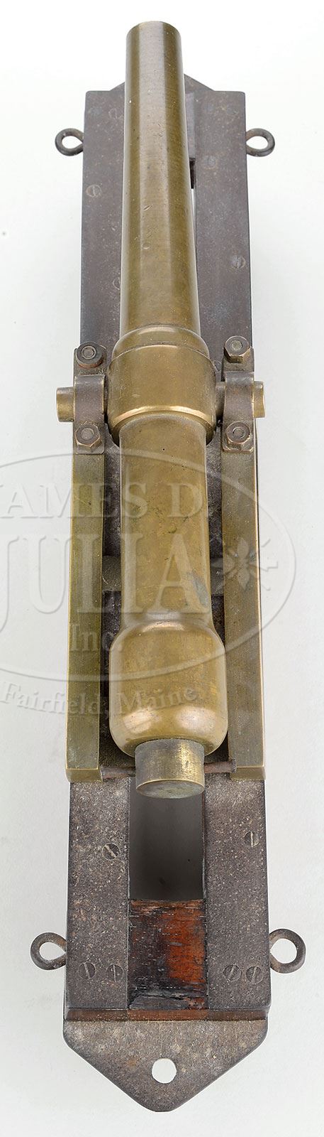 UNIQUE PATENT CANNON AND PIVOT-TYPE CARRIAGE MODEL.The Parrott-type cannon in this model with reinforced breech appears possibly as an afterthought as it is showing circa 1860 brass carriage utilized by Armstrong & Whitworth cannon of that era. Model is totally devoid of marking but displays well and was once part of the well known cannon model collection of Hampton P. Howell, Jr. PROVENANCE: Hampton P. Howell, Jr. Collection; Springfield Arsenal, LLC Artillery Collection. CONDITION: Model is 17″ long, 3″ wide, 6″ high, overall weight 5.5 lbs. Model is very good overall with non-functional breech, brass and iron patina on wood mount. 4-54154 (2,000-3,000) – Lot 2125