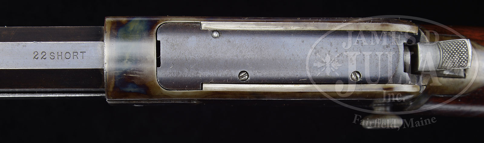 SCARCE 2ND MODEL WINCHESTER MODEL 1890 PUMP ACTION RIFLE.SN 45156. Cal. 22 Short. Standard grade rifle with 24-3/8″ oct bbl, 3/4 magazine, sporting front sight & sheet metal V-notch rear sight. Receiver, top & bottom tangs and buttplate along with the hammer & trigger are color case hardened. Mounted with uncheckered straight grain American walnut which includes a small round ribbed forearm & straight stock with crescent buttplate. This model was very high production but only a few were color case hardened. They were very popular as small game guns and for use in shooting galleries. CONDITION: Fine to very fine. Bbl retains 85-90% orig blue turning plum with scattered chemical spots and sharp edge wear. Magazine tube retains about 95% orig blue. Receiver retains 88-90% brilliant case colors with the losses primarily from rust spots on the top right rear side. Top tang retains faded case colors around the hammer slot. Trigger plate retains brilliant case colors with the bottom tang a gray/brown patina. Buttplate is a gray/brown patina. Wood is sound with light nicks & scratches and retains most of its orig finish. Mechanics are crisp, strong bright bore with scattered pitting. 51433-3 JRL (4,000-6,000) – Lot 2125