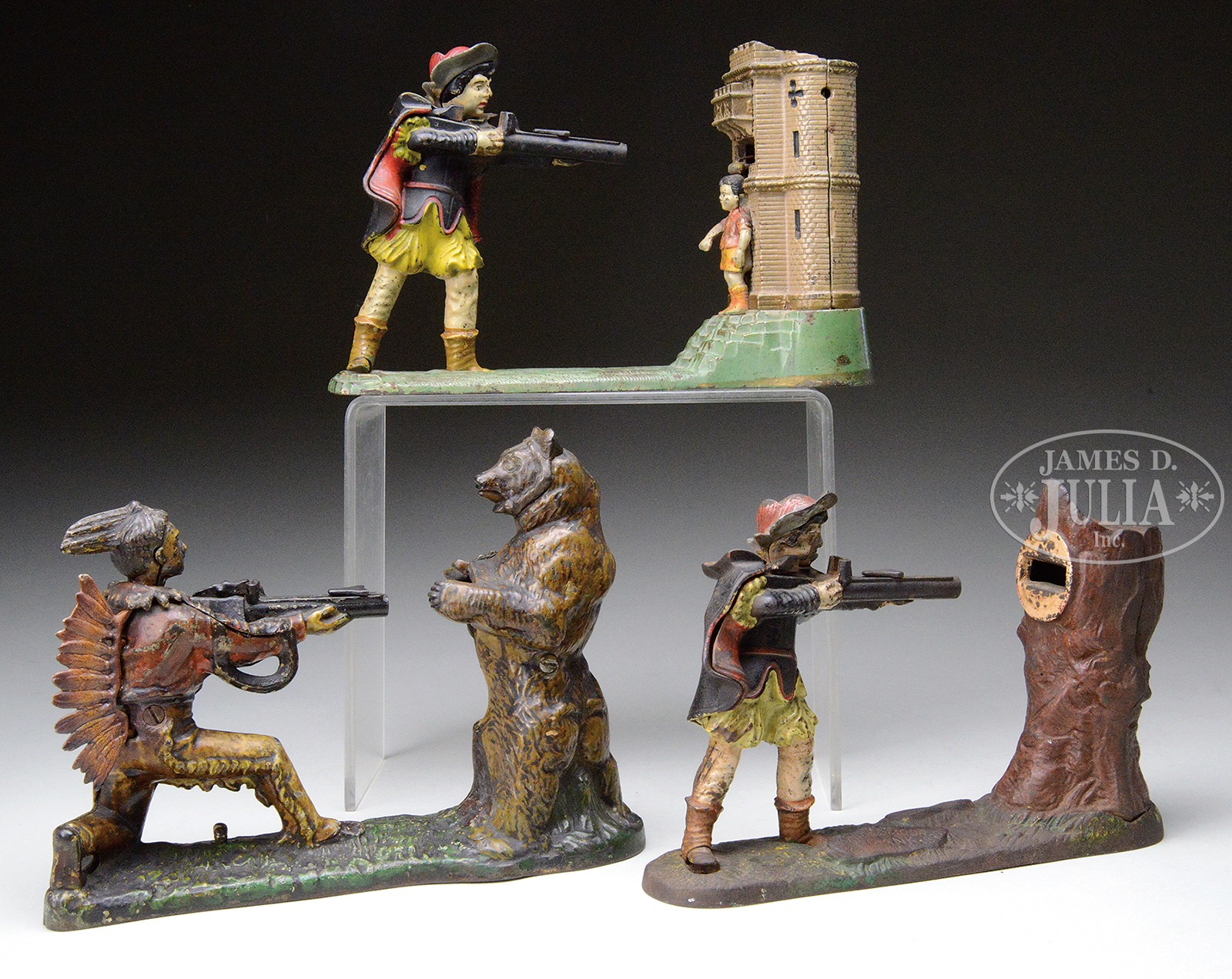 Please Note: The feathers on the Indian are replacements on bank #1. LOT OF 3 FIGURAL CAST IRON MECHANICAL BANKS.1) J&E Stevens & Co. Indian Shooting Bear mechanical bank. Highly decorated Indian shoots coin into chest of bear as animal’s mouth moves. 2) William Tell & Boy mechanical bank by J & E Stevens Co. William Tell & boy figures with father shooting apple off of son’s head. 3) J&E Stevens & Co./Creedmoor mechanical bank shows William Tell shooting coin into tree. SIZE: Largest is 10″ l. CONDITION: #1 & #2 average good paint with #3 having fair to good paint. All mechanics working. 48820-6 (600-1,000) – Lot 2127 Auction: Advertising, Toy & Doll - Spring 2015 Please Note: All prices include the hammer price plus the buyer’s premium, which is paid by the buyer as part of the purchase price. The prices noted here after the auction are considered unofficial and do not become official until after the 46th day. |