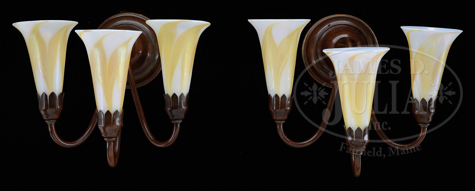 PAIR OF TIFFANY STUDIOS SCONCES.Tiffany Studios three arm sconces have rich reddish-brown patina with subtle green highlights. Sconces are finished with lily shades having bright gold iridescent pulled feather design against an opal-white background. Five of the shades carry spurious “L.C.T.” signatures, one is unsigned. SIZE: Sconces extend 11-1/4″ from wall. CONDITION: Very good to excellent. 50333-13 (2,500-3,500) – Lot 2127