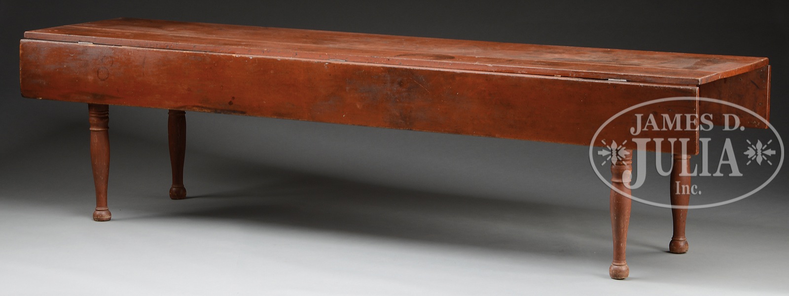 Circa 1830, Maine. A very large and robust example with great old red painted surface. The top comprised of a two board center with two single board drop leaves supported with simple rotating wood supports. Legs are robust and of Sheraton conformation terminating in ball feet. SIZE: 28-1/4″ t x 108″ l x 27″ w (leaves folded in) 42-1/2″ w (leaves open). PROVENANCE: From a Sidney Maine estate collection. CONDITION: Good, retaining great red painted surface. With pleasing wear and some age cracks and warping to top boards. 49379-3 (2,000-3,000) – Lot 2128
