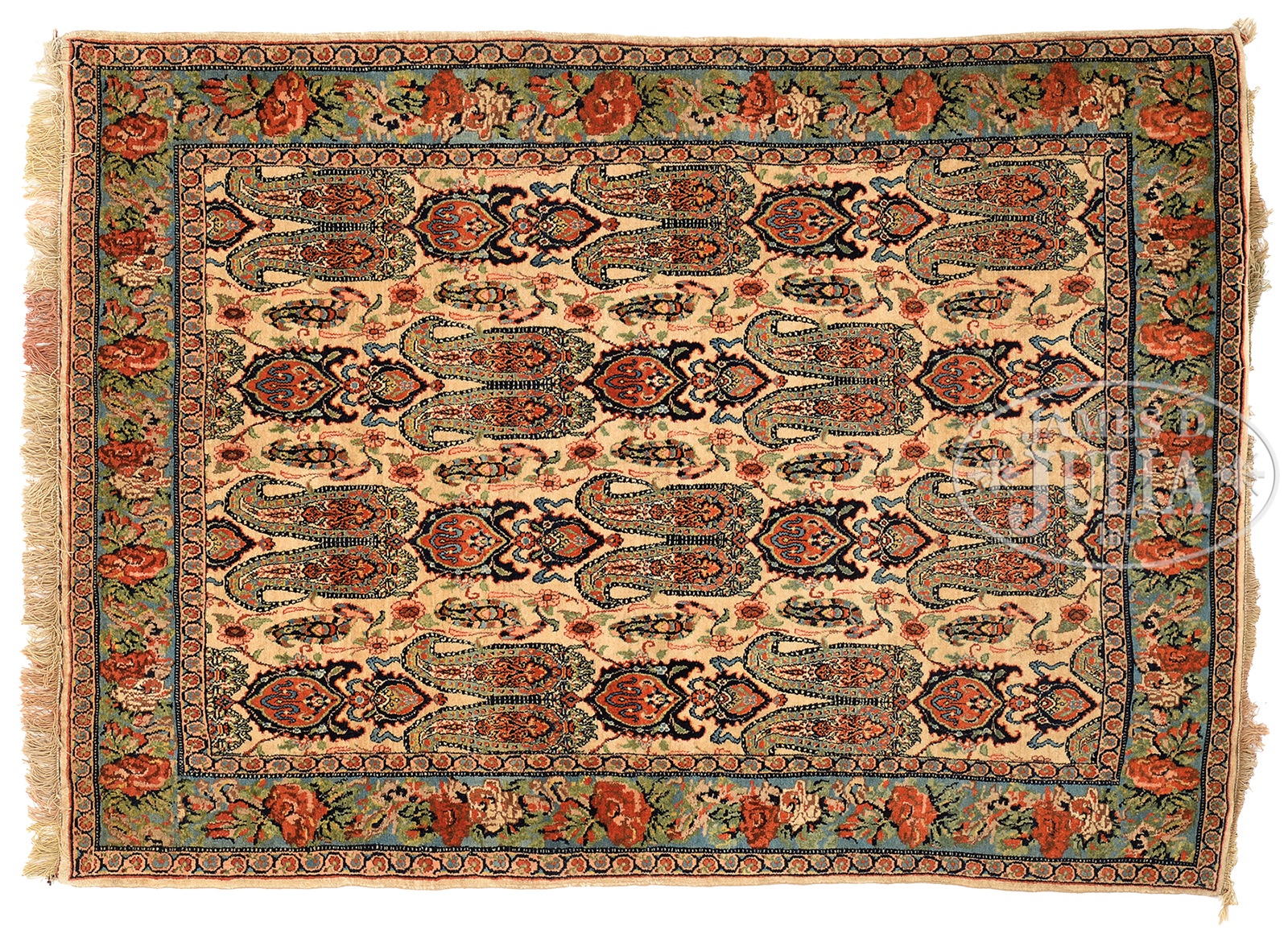 QUM ORIENTAL RUG, NORTH CENTRAL PERSIA.Mid-20th Century. Four rows of double gul and chevron decoration with dense floral vinery on a cream ground within a turquoise main border of Bijar floral design, the two guard borders of scrolling terra cotta and cerulean blue scrolling flower heads. SIZE: 4′ x 5’6″. PROVENANCE: A private Maine/Texas collection. CONDITION: Very fine overall retaining full pile and rich, vibrant palette. 50012-6 (800-1,200) – Lot 2128