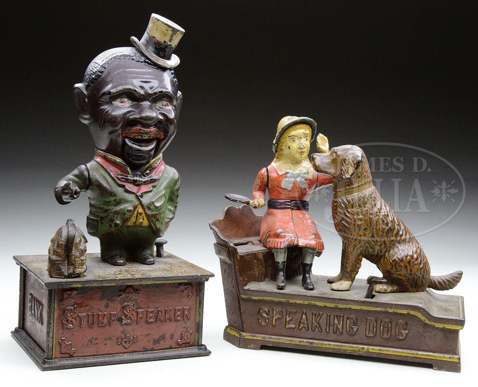 Lot includes Shepard Hardware Co. Stump Speaker, a desirable black caricature of a man on the campaign trail. Figure drops coin into carpet bagger style container as mouth moves. Also includes Speaking Dog mechanical bank by J&E Stevens, dog’s tail & mouth move as girl figure moves into seated area. SIZE: 10″ t and 8″ l, respectively. CONDITION: Good plus. 49192-1 (800-1,200) – Lot 2128C