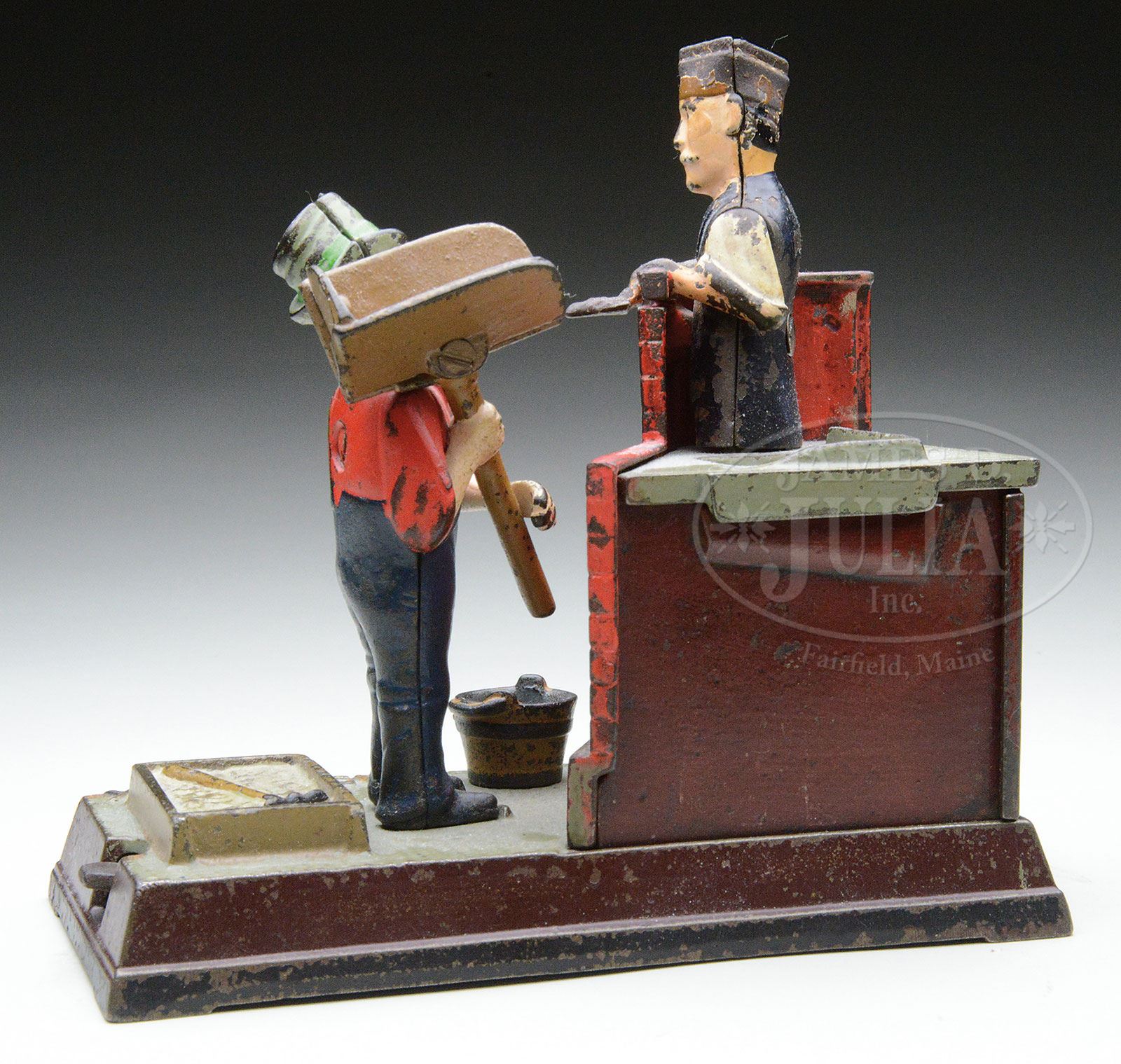 Please Note: The hod carrier figure has been repainted. CAST IRON MECHANICAL MASON BANK BY SHEPARD HARDWARE CO.Desirable 1887 mechanical bank shows standing figure tipping trough with coin. Mason above moves trowel as he lays brick. SIZE: 7-1/2″ l. CONDITION: Figures have typical chipping to upper body, brick area and below have good paint. 49192-2 (1,200-1,800) – Lot 2128A Auction: Advertising, Toy & Doll - Spring 2015 Please Note: All prices include the hammer price plus the buyer’s premium, which is paid by the buyer as part of the purchase price. The prices noted here after the auction are considered unofficial and do not become official until after the 46th day. |