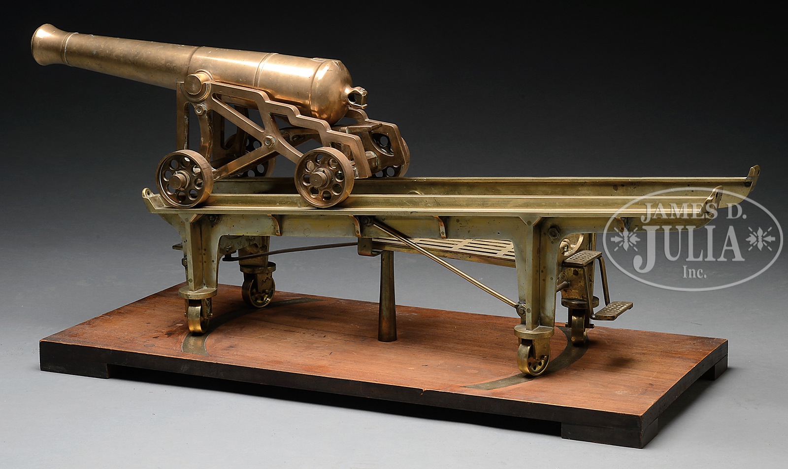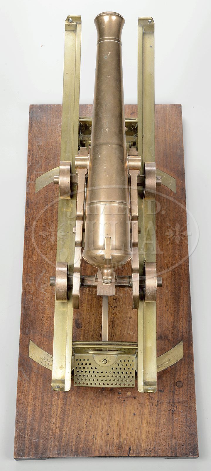 LARGE UNIQUE, 1828 BRASS AND COPPER ARSENAL PIVOTING SEACOAST GUN MODEL.This high quality gun, possibly a manufacturer or inventor’s model, measures 3′ overall with 19-1/2″ cannon and 1″ bore and weighs 78.5 lbs. Model is totally unmarked of brass and copper alloy construction, including pivoting wheels and tracks. Identical cannon & carriages can be found in British & Canadian coastal forts and fortifications. This traversing cast-iron platform for cast-iron carriage was adopted by British War Department March 1828. This is the only arsenal model we know of. PROVENANCE: Springfield Arsenal, LLC Artillery Collection. CONDITION: Yellow & mustard colored patinas. Very good overall as can be seen in photos. 4-54175 (4,000-6,000) – Lot 2129 Click here to view provenance