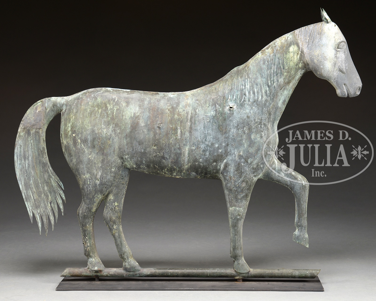 JEWELL WALKING HORSE WEATHERVANE.Attributed to A. L. Jewell & Co., Waltham, Massachusetts, third quarter 19th century. Cast zinc and repousse copper standing horse weathervane of dramatic large size. Accompanied by a museum type stand. SIZE: 30″ h x 40″ l. CONDITION: Fair, repairs to solder joints, bullet holes and tail. Some bullet holes and dents in body and dent to fore leg. Solder repairs to other front leg. 49203-5 (8,000-12,000) – Lot 2129