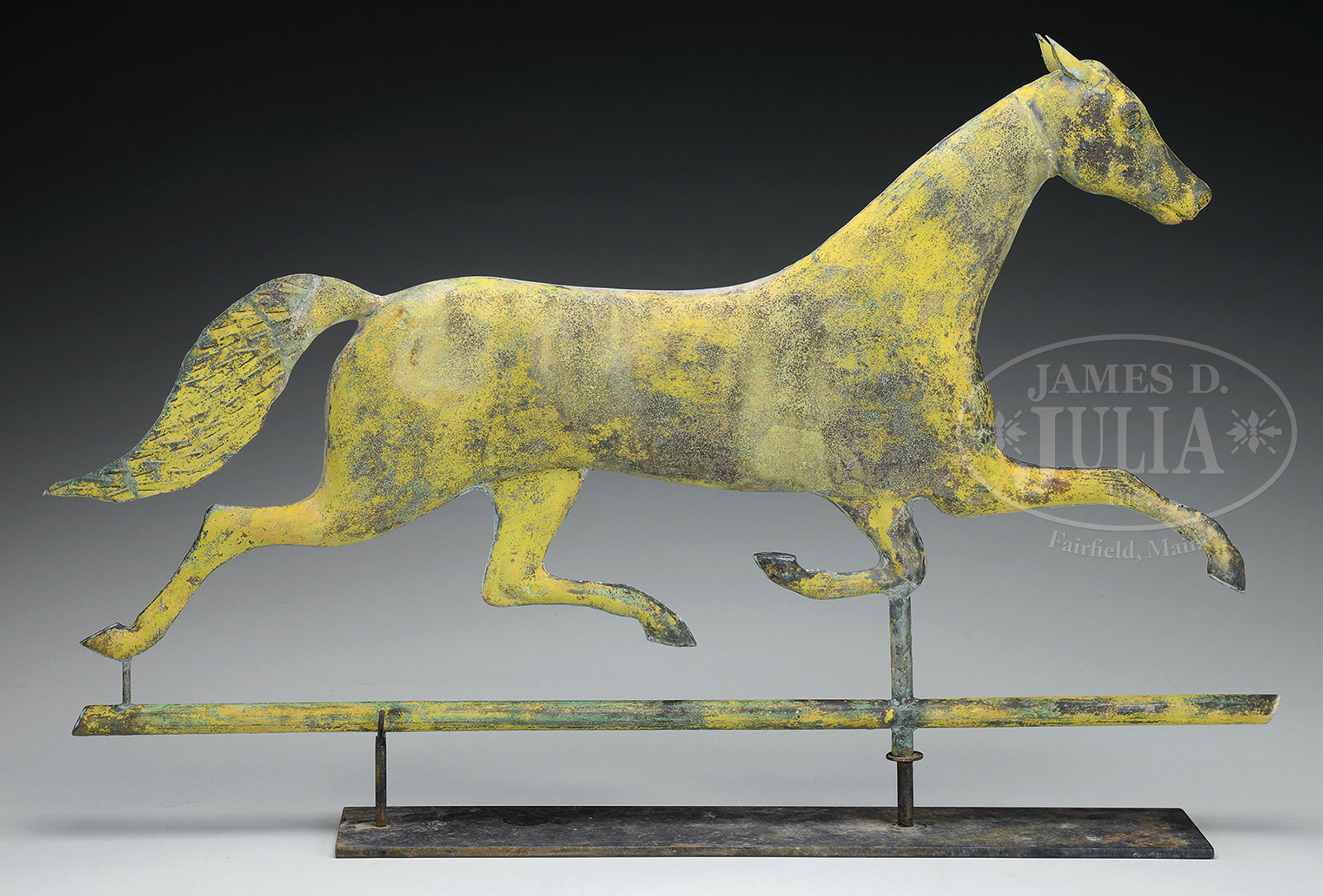 RUNNING HORSE WEATHERVANE ATTRIBUTED TO A.L. JEWELL.Third quarter 19th century. Of typical form with cast metal head. Accompanied by stand. SIZE: 28″ l x 17″ h. CONDITION: Bullet hole repairs with paint touch up. 51971-1 (3,000-4,000) – Lot 2129