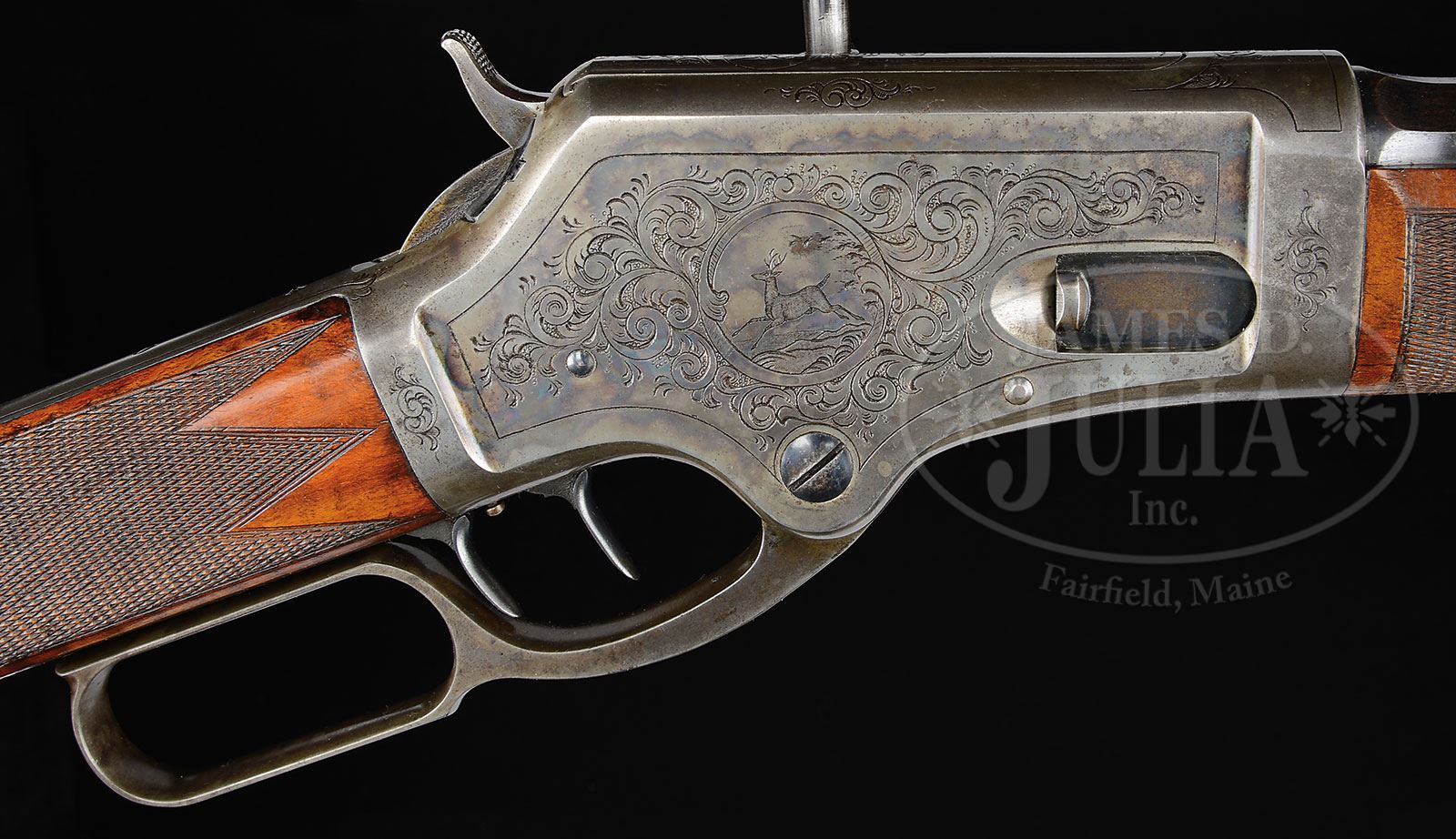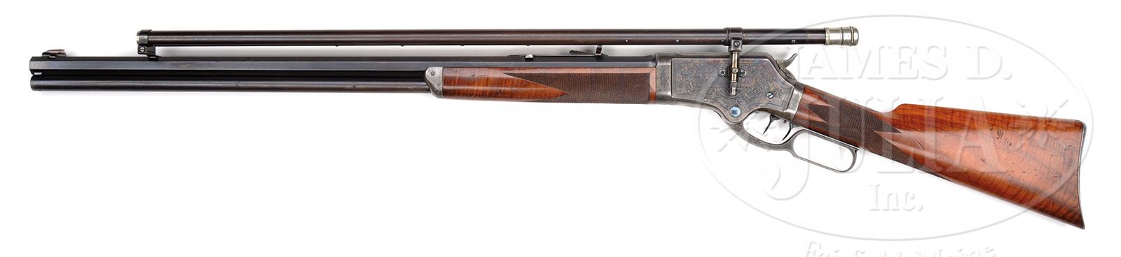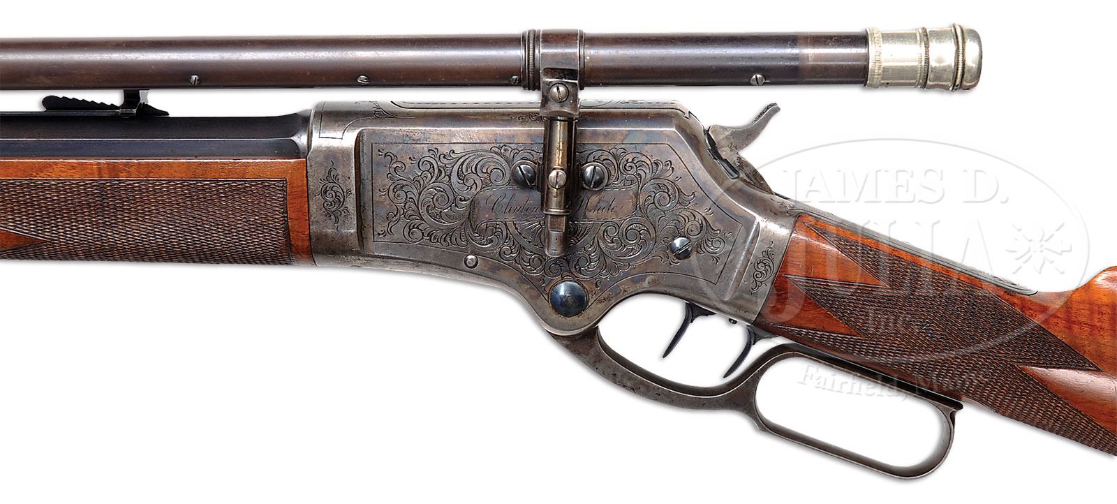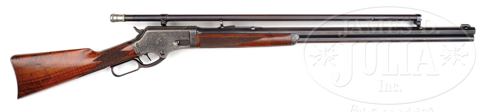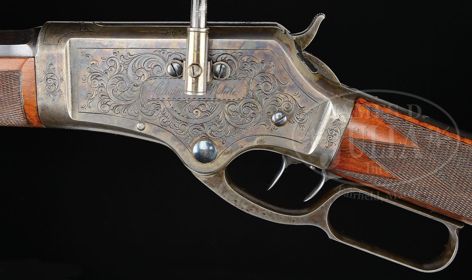 VERY RARE DELUXE FACTORY ENGRAVED & INSCRIBED MARLIN MODEL 1881 LEVER ACTION RIFLE WITH SCOPE.SN 7043. Cal. 40-60. Wonderful deluxe Marlin with 28″ oct bbl, full magazine, gold bead sheard front sight and Marlin full buckhorn rear sight. Left side of receiver has an adjustable Slotterbeck/Lakeport marked scope base attached over the engraving with an additional dovetail for the front mount in the top flat of the bbl, containing a 30″ Malcolm scope with nickel silver eye piece. Mounted with very nicely figured, checkered American walnut with straight stock and Marlin smooth steel, semi-crescent buttplate. Receiver has Marlin double-set triggers. Receiver is beautifully engraved, probably by Conrad Ulrich in #2 pattern with a vignette of a running whitetail buck on the right side. Engraved in the ribbon on the left side is the inscription “Clinton L. White”. The bolt dust cover is engraved with the head of a whitetail buck. All the vignettes are surrounded by very fine foliate arabesque patterns and simple line borders. Consignor states that the scope was mounted by the Slotterbeck Co. during the period of use. This exact rifle is pictured on p.678 of Marlin Firearms, Brophy. According to Flayderman’s Guide to Antique American Firearms only about 20,000 of this model was produced in the period 1881-1892 with very few being made in deluxe configuration, and of those, extremely few were engraved. Inscribed pieces are even more rare, as are those with period scopes. Reference publication also states that only 6,261 models 1881 were produced in 40 caliber. Accompanied by a large volume of material including a Cody Firearms Museum/Marlin Firearms Co. letter which identifies this rifle in caliber 40-60 with 28″ bbl and set trigger shipped Feb. 11, 1884. A Cody Firearms Museum worksheet additionally states “light weight receiver”. Also included in this packet is a copy of a photograph of Clinton L. White. Additionally, there are four typewritten pages of genealogical research regarding Clinton L. White, his background, education and professional life. In addition there are copies of pages from the history of Sacramento County regarding Clinton L. White. In addition there are numerous newspaper articles about Mr. White including his death notice. There is also a copy of Charles Slotterbeck’s patent for “telescope attachment for fire-arms” dated Oct. 8, 1878, plus information about the Slotterbeck company. Clinton L. White (1850-1925) early in his career taught school in Placer County, CA. In 1877 he became an attorney, published a law book in 1879 and was secretary of the judiciary committee of the California State Senate, 1880-1881. For two years 1881-1882 Mr. White was the deputy attorney general of California. He was also a member of the California National Guard for ten years, reaching the rank of Major and Judge-Advocate. He was a partner in several law firms and became Mayor of Sacramento 1908-1910. CONDITION: Very fine. Bbl & magazine tube retain about 75% orig blue with the balance turning plum in a couple spots about mid-point on the bbl; receiver retains most of its orig case colors, moderately faded, stronger and brighter on the left side; bottom of the receiver is mostly faded to silver; lever & hammer retain faded case colors; top tang is grey metal, as is the buttplate. Wood is sound with a few light nicks & scratches showing light diamond point wear on the checkering and overall retains 95-97% strong orig varnish. Mechanics are crisp; brilliant shiny bore. Optics are clear but need cleaning. 4-51297 (25,000-35,000) – Lot 2130 Click here to view provenance