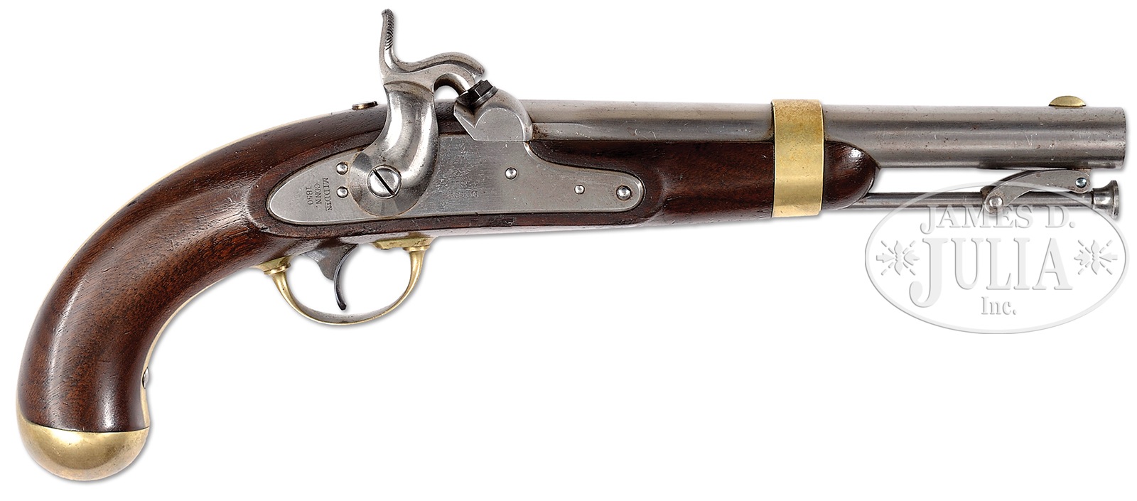PRIME MODEL 1842 H. ASTON PERCUSSION PISTOL.SN NSN. Cal. .54. 8-1/2″ bbl. Dated 1850 on both lock and bbl tang. H. Aston, lock, bbl and swivel type ramrod assembly are still in their orig armory bright. Brass backstrap, buttcap and bbl band are uncleaned and have obtained a pleasant patina. Walnut stocks with proper and very legible “U.S. Government” cartouches. CONDITION: Near arsenal new. Bore and breech face being near bright shed doubt of ever being fired. Nipple still retains most all orig arsenal blue, hammer shows virtually no nipple strike as in near new condition. All U.S. inspectors, dates and inspections are all highly visible and and legible. Would be very difficult to improve upon and would complement any collection. 50671-1 TDW (3,000-5,000) – Lot 2130