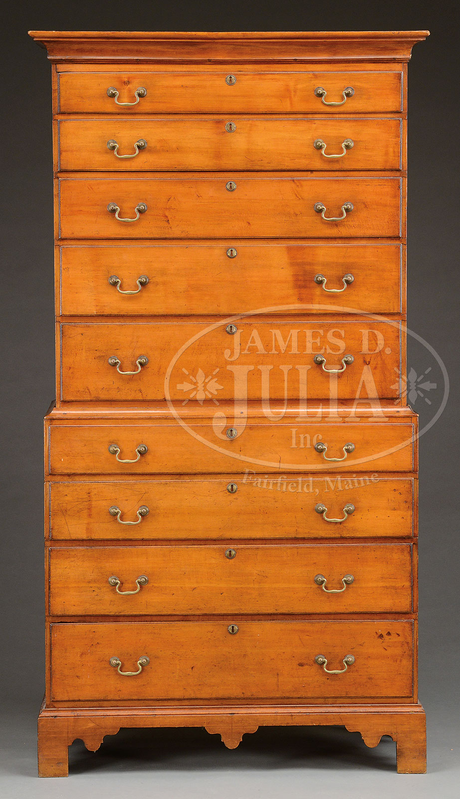 CHIPPENDALE MAPLE CHEST-ON-CHEST.Last quarter 18th century, New England. In two parts, rectangular dovetail upper case with cove molded cornice over four graduated thumb molded long drawers fitted to molded lower case of four graduated drawers with thumbmolded edges on molded base raised on bracket feet with dramatic shaped double returns matching central drop pendant. Chest on chest with original brasses. SIZE: 75-1/2″ h x 36″ case w x 38-1/2″ overall w x 19″ d. CONDITION: Old surface professionally cleaned and polished with wonderful mellow light honey brown color and good patina with original cornice and feet. Wide backboard original. Very good overall. 52135-3 (2,500-4,500) – Lot 2130