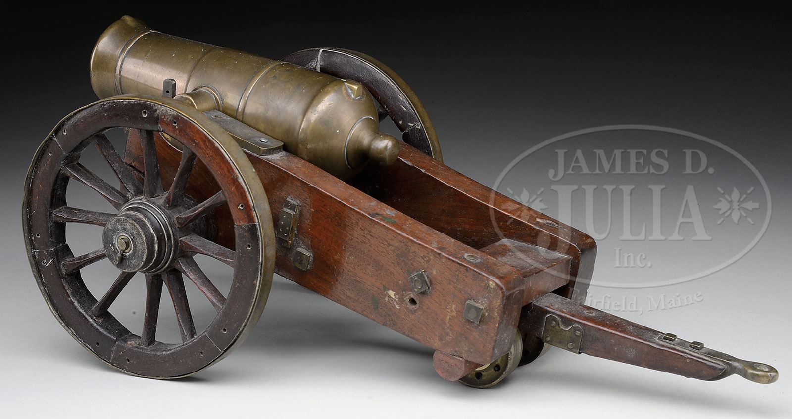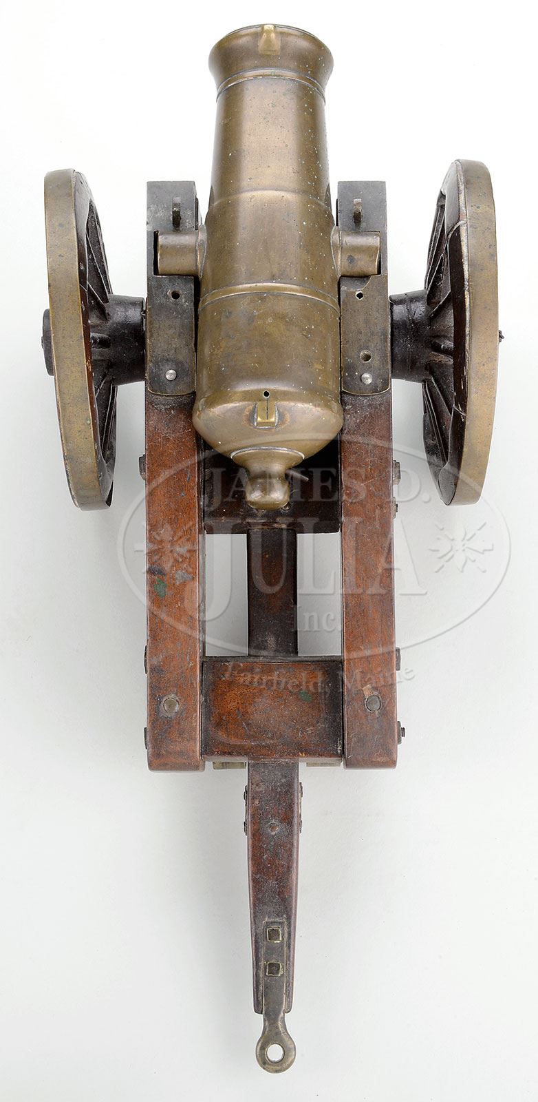 ENGLISH BRASS HOWITZER MODEL ON CARRIAGE.This fine model which measures 16-1/2″ long, is just over 7″ wide and weighs 9 lbs has front and rear sights cast and insets separately in lighter colored metal. Cannon is in mid-19th century English style without lifting handles and was once in the collection of Hampton P. Howell, Jr. and was on display in Ft. Ticonderoga. PROVENANCE: Hampton P. Howell, Jr. Collection; Springfield Arsenal, LLC Artillery Collection. CONDITION: Model is very good overall with patina and some verdigris spotting. Carriage is sound & solid, missing trunnion caps and may be a later edition that was made specifically for this model. Sound and well made wood-hubbed & spoked wheels. 4-54159 (3,000-4,000) – Lot 2131