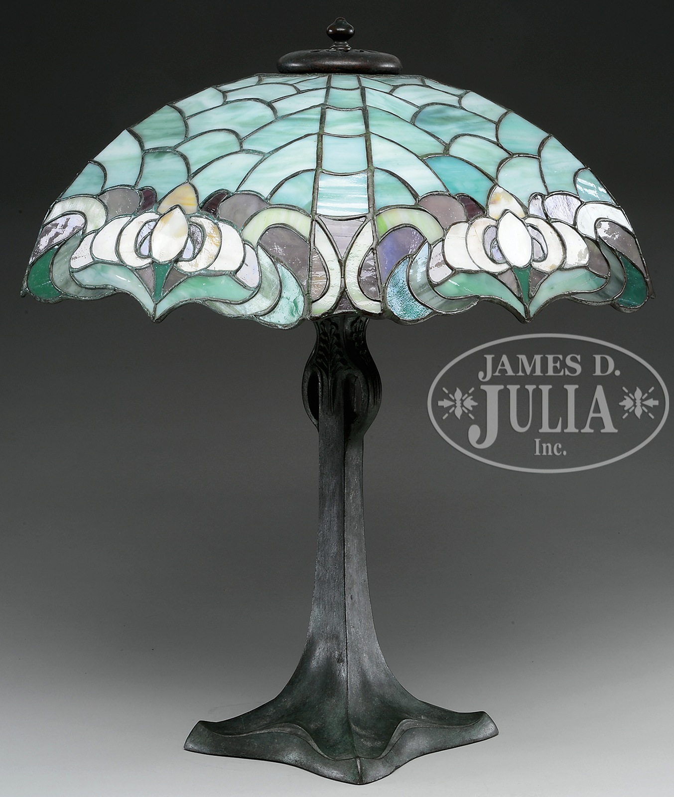 DUFFNER & KIMBERLY OWL TABLE LAMP.Duffner & Kimberly table lamp has colorful leaded band surrounding the bottom of the shade in the form of a stylized owl’s head. Band is done in amber, cream, red and green glass, and is all set against a background of curving panels in light striated green and white glass. Shade rests on a Duffner & Kimberly base with square foot and stem supporting a three-socket cluster. Base is finished with a brown patina with very heavy green highlights and is topped with a fleur de lis heat cap. SIZE: Shade is 15″ sq. Lamp is 22-1/2″ t. CONDITION: Shade is very good with a few tight hairlines. Base is very good with some minor discoloration to patina. 5-68846 (4,750-5,250) – Lot 2132