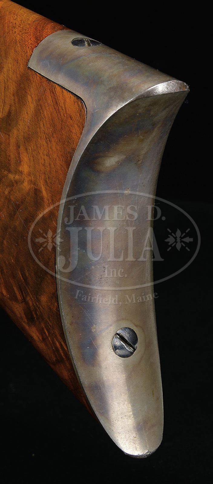 EXTREMELY RARE SPECIAL ORDER DELUXE MARLIN MODEL 1888 LEVER ACTION RIFLE.SN 24886. Cal. 44 WCF (44-40). Very rare rifle with 24″ oct bbl, special order half magazine, nickel silver Rocky Mountain front sight, semi-buckhorn rear sight and Lyman combination tang sight. Mounted with very highly figured, center feather crotch American walnut with early B-style checkered forearm and straight stock with crescent buttplate. Accompanied by a Cody Firearms Museum worksheet and a copy of the ledger page including this serial number which shows that the entry for this serial number is blank. According to Flayderman’s Guide to Antique American Firearms there were only 4,814 of these rifles produced in three calibers and six bbl lengths. Of that total 1,727 were in caliber 44. Extremely few of those were special ordered and exceedingly few were deluxe. This is Marlin’s first model to utilize the short pistol-type cartridges, and their last top ejection model. This is the smoothest, easiest to operate lever action in the Marlin line. Only a handful of Dlx 1889s known and this is reportedly one of the top three extant. CONDITION: Extremely fine plus. Bbl & magazine tube retain 98-99% strong orig blue with only very faint sharp edge wear; forend cap also retains about 98% bright blue with some minor candy striping; receiver retains about 95% bright orig blue with a few light nicks & scratches and sharp edge wear. Lever & hammer retain virtually all of their strong orig case colors, lightly faded with outer faces of lever turning silver; buttplate retains virtually all of it’s moderately faded orig case colors. Wood is sound with a very few, scattered storage & handling nicks & scratches and retains about 99% crisp orig varnish. Mechanics are crisp; brilliant shiny bore. 4-51294 (17,500-27,500) – Lot 2133 Click here to view provenance