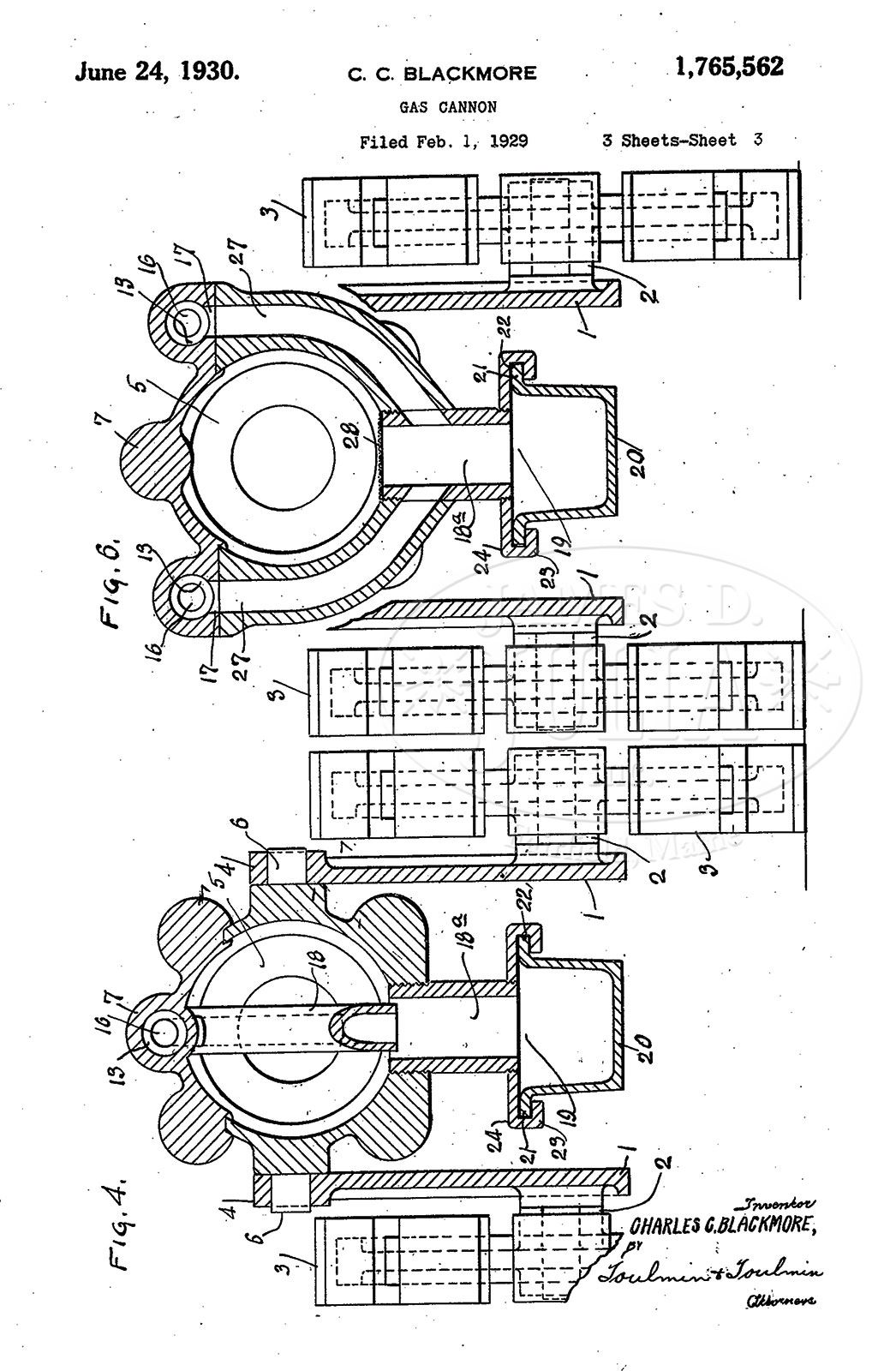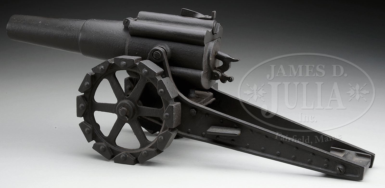 RARE AND VERY FINE DAYTON TOY & SPECIALTY COMPANY “CHARLES BLACKMORE PATENT” CARBIDE TOY CANNON, 1928.It is interesting that this “Big Bang” carbide cannon competitor was advertised in magazine “Playthings” December, 1928 three months before the patent was applied for. Dayton Toy Specialty Company offered carbide cannon as item number 110 in this ad for sell for four-dollars. This functional toy cannon has appearance of WW1 heavy field guns. Dayton Toy & Specialty Company made a line of metal trucks, cars and other boy’s toys till the Great Depression put them out of business. Toy weighs 14 pounds and is 20” long. There are thought to be very few survivors of this cannon as we can find no recorded sales of this rare toy and only two examples in toy museum or collections. Charles C. Blackmore’s patent was filed February 1, 1929, Serial No. 336,816. Blackmore was an extremely prolific inventor of the 1920’s-30’s. Google patents lists no fewer than 338 patents for toys, bombs, guns, shock absorbers, fans, radios, and other consumer, industrial, and military hardware of all kinds. “It is the object of my invention to provide a gas cannon in which the generation of the gas (acetylene) and the conveying of the materials to a gas forming chamber will be remote from the chamber of the gun. My object is to provide a gas gun having the safety feature of complete delivery of materials and generation of the gas remotely from the gun chamber as distinguished from that class of gas guns and cannons where the is generated in the chamber of the gun. It is a further object to provide means of exactly measuring the quantity of carbide and other gas forming material which is to be delivered to the gas forming chamber without using any moving parts for such measurement like valves, etc. It is a further object to provide such a measuring means in combination with ventilation means to insure positively the ventilation of the gun or cannon between each measurement and delivery of gas forming material to the gas chamber. It is an additional object to provide a gas forming chamber which carries water or other gas forming material that can be detached front the cannon and thoroughly cleaned. (Other) carbide gas cannons have quickly become useless because the accumulation of precipitate, which rapidly hardens in the air rendering the gun useless. It is a further object to provide a gas cannon in which the charge can be ignited by a fulminate cap. It is also an object to provide such a cannon in which the charge can be ignited by pyrophoric metal or a fulminate cap at the option of the user. It is an important object of my invention to provide a striking hammer and lanyard for remote firing of the cannon to insure the removal of the child at some distance from the cannon before it is fired. It is my object to provide a gas-forming chamber which is suspended at some distance from the cannon so that all the gas must be generated remotely from the interior of the cannon and then delivered in gaseous form to the barrel of the gun or cannon.” PROVENANCE: Springfield Arsenal, LLC Artillery Collection. CONDITION: Very good and functional as painted with a dark OD paint. 4-54161 (800-1,200) – Lot 2133