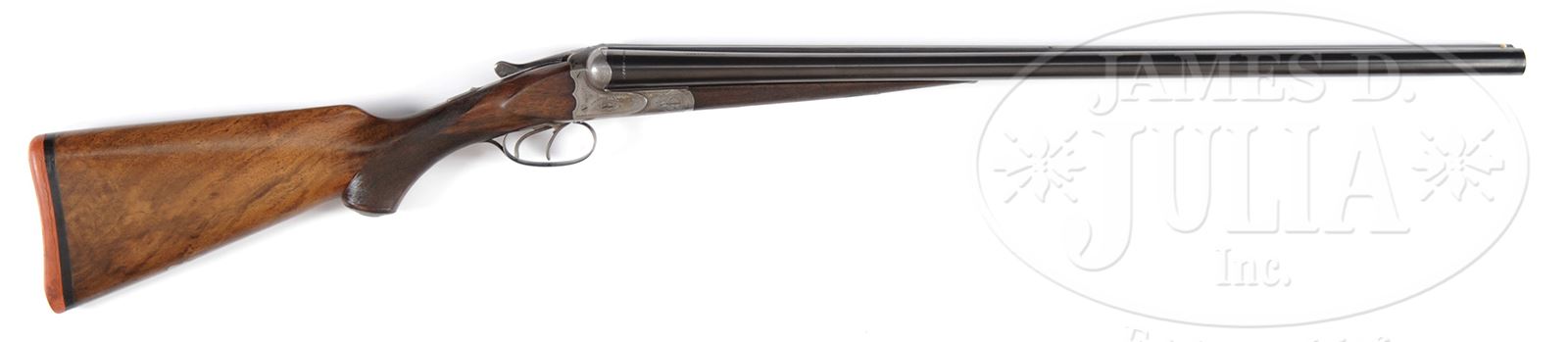 *J P SAUER & SON 12GA BOXLOCK LIGHTWEIGHT GAME GUN.SN 132350. Cal. 12 Ga. 26″ Krupp steel bbls, 2-1/2″ chambers, dbl triggers, extractors, automatic safety. Matted rib with twin “certifiable pre-ban ivory” beads. Scalloped boxlock action with Greener crossbolt and side clips. Checkered splinter forend and pistol grip stock with lightly engraved steel grip cap. Trigger guard lightly engraved with SN at tang. Lightly engraved action. LOP 14-1/2″ over hardened red recoil pad. Weight 6 lbs. 1 oz. . Left bbl choke cylinder. Right bbl choke Imp. Mod. Special Note: This item contains or is made of ivory. Do not bid on this lot unless you have read and agreed to our "Ivory Position Statement" and the "Waiver of Legal and Financial Risk to James D. Julia in regards to your Purchase of an Ivory Object." This information is located in the front section of our catalog. CONDITION: Fine. Bbls retain most of a restored finish. Action retains hint of case colors in protected areas only. Forearm and buttstock checkering slightly worn but mostly visible with some added finish and tiny losses. Action shows a hint of looseness and would benefit from a gentle cleaning, will make a nice lightweight field gun. 49272-2 JSL12 C&R; IVORY (750-1,250) – Lot 2133