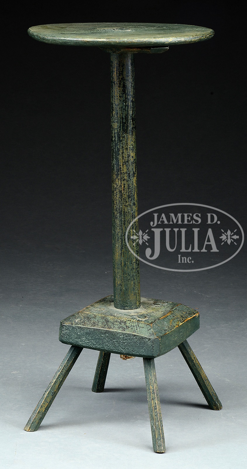 GREEN PAINTED PEG LEG CANDLESTAND.Circa mid 18th century, New England. Pine, ash, cleaned to original Windsor Green paint. Circular, carved chamfered edge top, affixed to beveled, chamfered cleat. Mortise joined carved round shaft, chamfered square platform, with mortised splayed octagonal legs. SIZE: 13″ dia. CONDITION: Good condition with minor abrasions and paint wear. 9-96601 (1,000-2,000) – Lot 2134