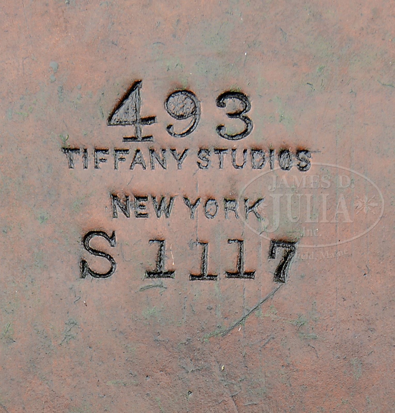 TIFFANY STUDIOS CANDLE LAMP.Tiffany Studios candle lamp has bronze oval foot supporting double arms leading to jeweled candle cups. Each cup is set with white opalescent cabochon jewels. Lamp is complete with center stem terminating in stylized flower bud. All finished in rich brown patina with red highlights. Base is signed “Tiffany Studios New York 493 S1117”. Candle lamp has been electrified, most likely at factory and supports two gold favrile candle shades with vertically ribbed bodies. Each finished in bright gold iridescence with strong red highlights. Both shades signed in fitter “L.C.T.”. SIZE: 12″ to top of shade. CONDITION: One shade has small flake to outside of fitter which is concealed when shade is in place, otherwise lamp is very good to excellent. Re-wired with appropriate cloth cord. 50312-2 (7,500-9,500) – Lot 2134