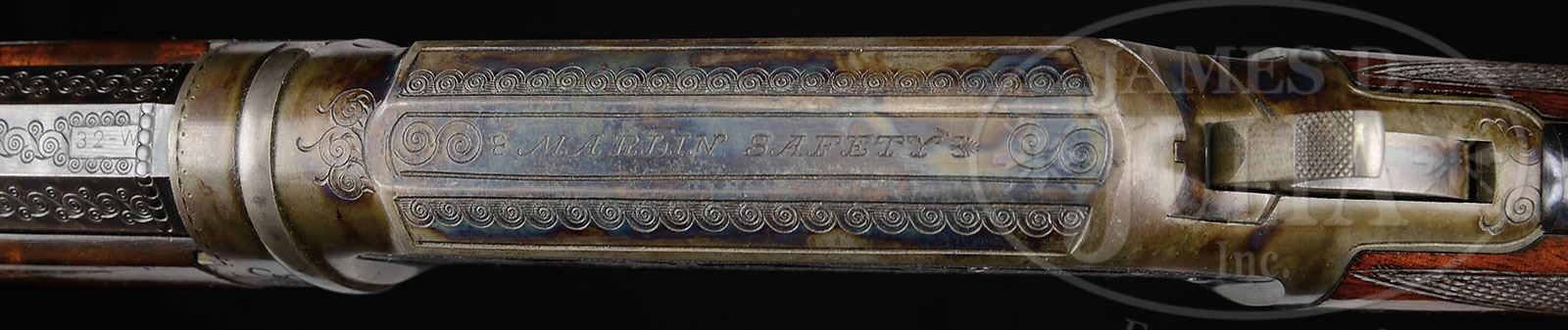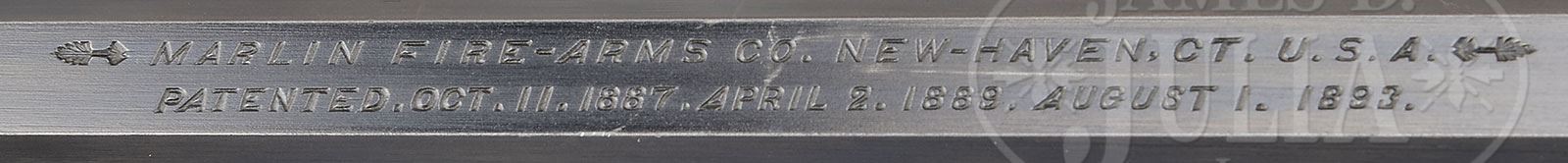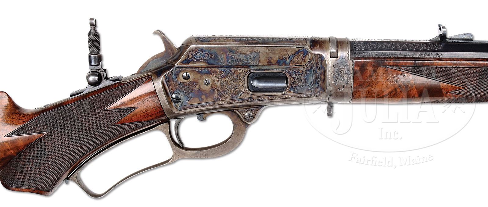 SN 121581. Cal. 32 WCF (32-30). Extremely rare rifle with 24″ oct to rnd bbl, half magazine, takedown with ivory bead Beach’s style combination front sight, semi-buckhorn rear sight & Lyman combination tang sight. Mounted with highly figured flame & shell grain American walnut with B-style checkered forearm and serpentine grip buttstock and crescent buttplate. Grip cap is inlaid with a small silver oval engraved with three intertwined old English style initials the are indecipherable. Buttstock & forearm have special order sling swivels. Receiver, takedown ring, forend cap and about 2-1/2″ of the bbl over the chamber area are wonderfully engraved in #3-4 style by Conrad Ulrich. Engraving consists of the vignette of a whitetail buck in a very detailed forest scene on the left side and of an English Setter on point on right side of the bolt. Receiver on both sides is engraved with light foliate arabesque patterns and very well detailed multiple borders. Engraving extends over the top & bottom of the receiver & top tang. Accompanied by a Cody Firearms Museum/Marlin Firearms Co. letter which identifies this rifle in caliber 32-24 (obviously a typographical error of 32-20), 1/2 oct bbl, pistol grip, 1/2 magazine and takedown shipped May 15, 1895, as one of the last 7 regular production units. As is typical with Marlin records there is no mention of the deluxe checkered wood or the engraving. This rifle is pictured on p.174 of the book Marlin Firearms, Brophy. The caption to that photograph states “only 28 of this model are recorded as having the takedown feature”. According to a chart on the following page of the referenced publication, of the approximate 55,000 Models 1889 produced in the period 1889-1899 only 15,440 were in caliber 32, the majority of which had oct bbls. Mr. Brophy, in his book, lists 1/2 oct bbls for this model as one of the “scarcest variations”. This was Marlin’s first model produced with solid top and side eject which distinguished it from its competitors, a design still being produced today. Extremely few of this model are found with any of the special order features found on this rifle and the combination of all the features found here is extraordinary. CONDITION: Extremely fine. Bbl retains 96-98% strong orig blue with very light sharp edge wear, some light scratches on the round portion and a series of nicks on toe of the round area; receiver & bolt retain virtually all of their bright, orig factory case colors; takedown ring is moderately faded; hammer retains strong, bright case colors and the lever bright case colors on the sides, faded on the outer faces; buttplate retains strong, lightly faded case colors with some minor freckling and fading toward the toe. Stock has a long scratch by the buttplate with a few other minor nicks & scratches and overall retains virtually all of its orig factory varnish. Mechanics are crisp; brilliant shiny bore, may be unfired. A truly rare and desirable Marlin being one of only 4 engraved takedowns known, suitable for the most discerning collector. 4-51292 (27,500-37,500) – Lot 2136