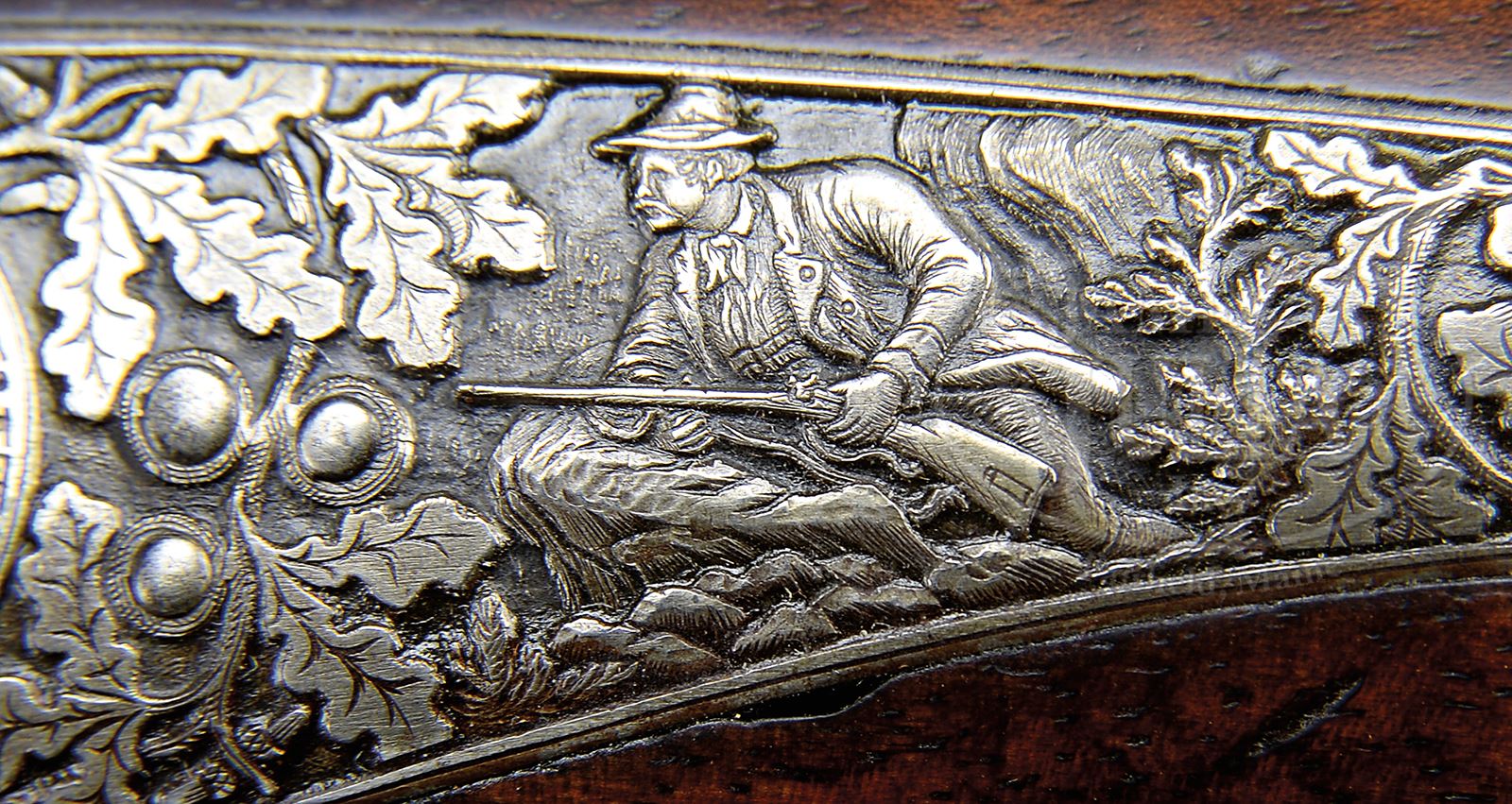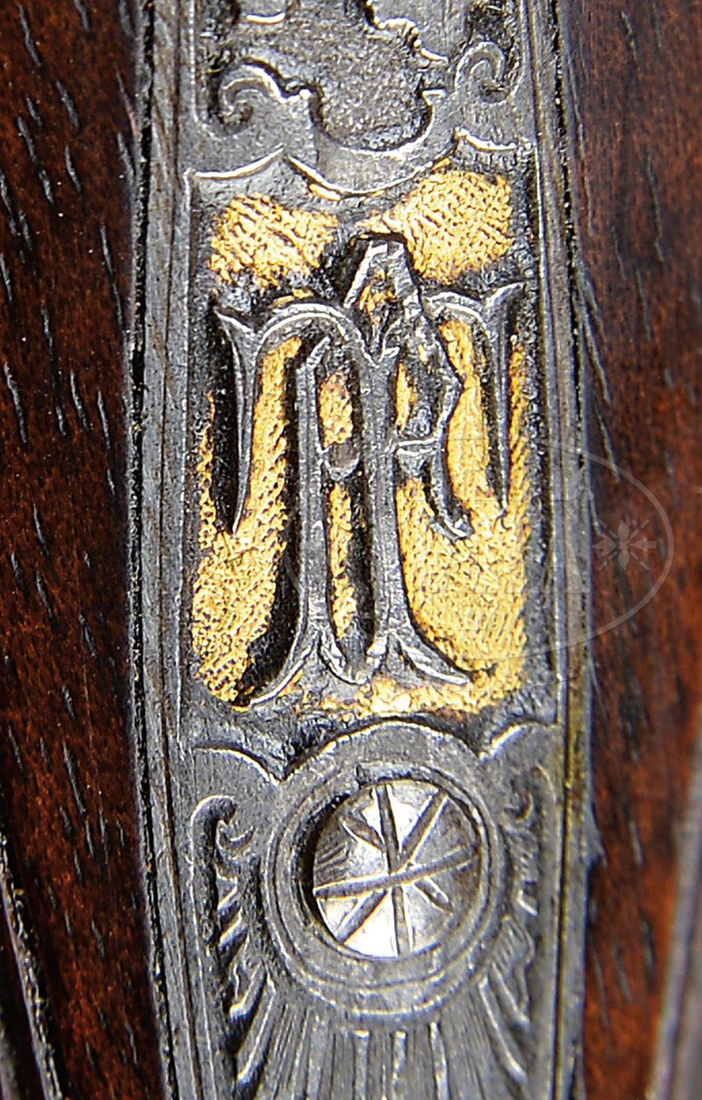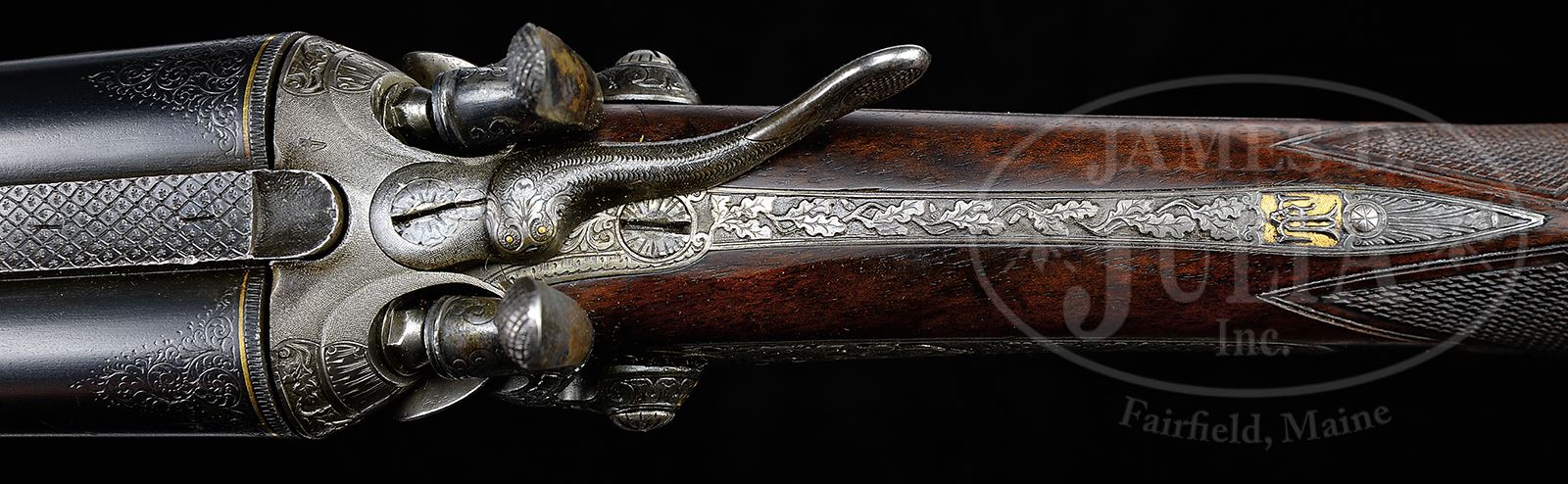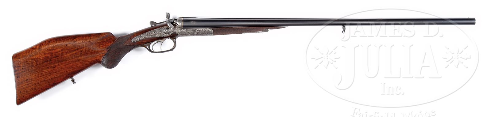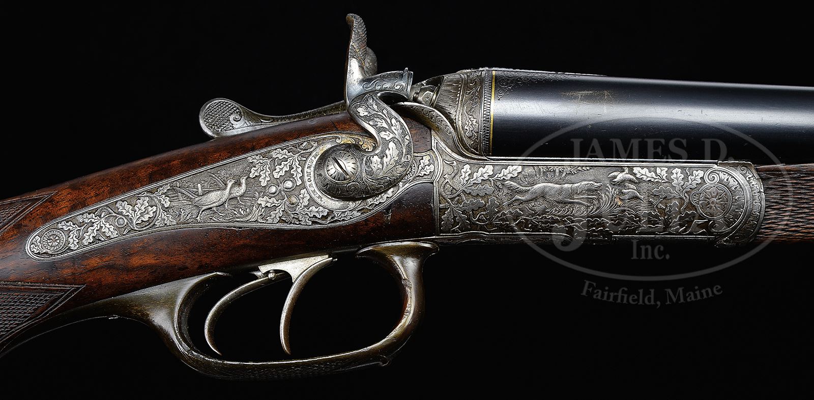 HIGH QUALITY FULL RELIEF ENGRAVED TOP LEVER HAMMER GUN WITH WHITWORTH BARRELS BY H. SCHERPING OF HANNOVER.SN NSN. Cal. 16 ga. 2-9/16″ Chambers. 28-1/2″ Dovetailed steel bbls are engraved “H. SCHERPING HOF – BUCHSENMACHER HANNOVER.” on concave game rib with dolls head extension. There are 1″ triangles of well cut scroll and gold bands at breech ends. Bbl flats are devoid of any markings. Bottoms of bbls are stamped with British proofs and are engraved “SIR JOSEPH WHITWORTH’S” “FLUID COMPRESSED STEEL”. A sling loop is soldered to bottom rib. Round bodied top lever action with lever filed and shaped like a fish with gold eyes, is fitted with peninsula rebounding back action locks with round bodied serpentine hammers. Action and locks are profusely engraved with exceptionally well cut, detailed and shaded, relief oak leaves, branches, and acorns surrounding truly exceptional game scenes with a pair of black cock sparring on left side of action, and a setter chasing a flushing pair of grouse on right. Right lockplate depicts a pair of pheasant strutting through garden, and left lock has an extremely fine portrait of what could be the person for whom this gun was made, in hunting regalia with gun, peering over a rock. “H. SCHERPING” is engraved on left lock behind hammer and “HANNOVER” is behind hammer on right. A high relief monogram “TF” is in gold poincon at rear portion of top tang. Trigger guard is of horn, and is checkered on bow. Nicely fiddle figured European walnut round knob pistol grip buttstock has high hogback comb and measures 14-1/4″ over checkered wood butt. Stock features small shadow line right hand cheekpiece, point pattern checkering with broad mullered and line borders at grip, and a sling loop matching that on bbl, on toe line. Matching fully checkered splinter forend has pivoting lever release. Bore diameter: left -.665, right -.662. Bore restrictions: left -.020 (Mod), right -.007 recess (IC). Wall thickness: left -.029, right -.032. Drop at heel: 3-3/8″, drop at rear of comb: 2″, drop at front of comb: 2-1/2″. Weight: 6 lbs 2 oz. LOP: 14-1/4”. CONDITION: Very fine, as refinished. Bbls retain over 90% of what appears to be a very old re-black, over some marks and scratches, with a few subsequent marks, mostly on right bbl where two dents have been raised. Action and locks retain traces of case color, but are mostly pewter gray, engraving remains excellent. Horn trigger guard is good with no insect damage, but has repaired crack at base. Stocks retain nearly all of an old oil refinish over numerous light marks, checkering competently re-cut. Bores are very fine, showing some scattered light pitting and a few striations, and the aforementioned areas of dent removal. Action is very slightly loose with forend removed, but tight with forend in place. Bbls are slightly off face. Locks are crisp. An exceptional steel barreled hammer gun by this highly regarded maker. 49224-13 MGM38 (4,000-6,000) – Lot 2136
